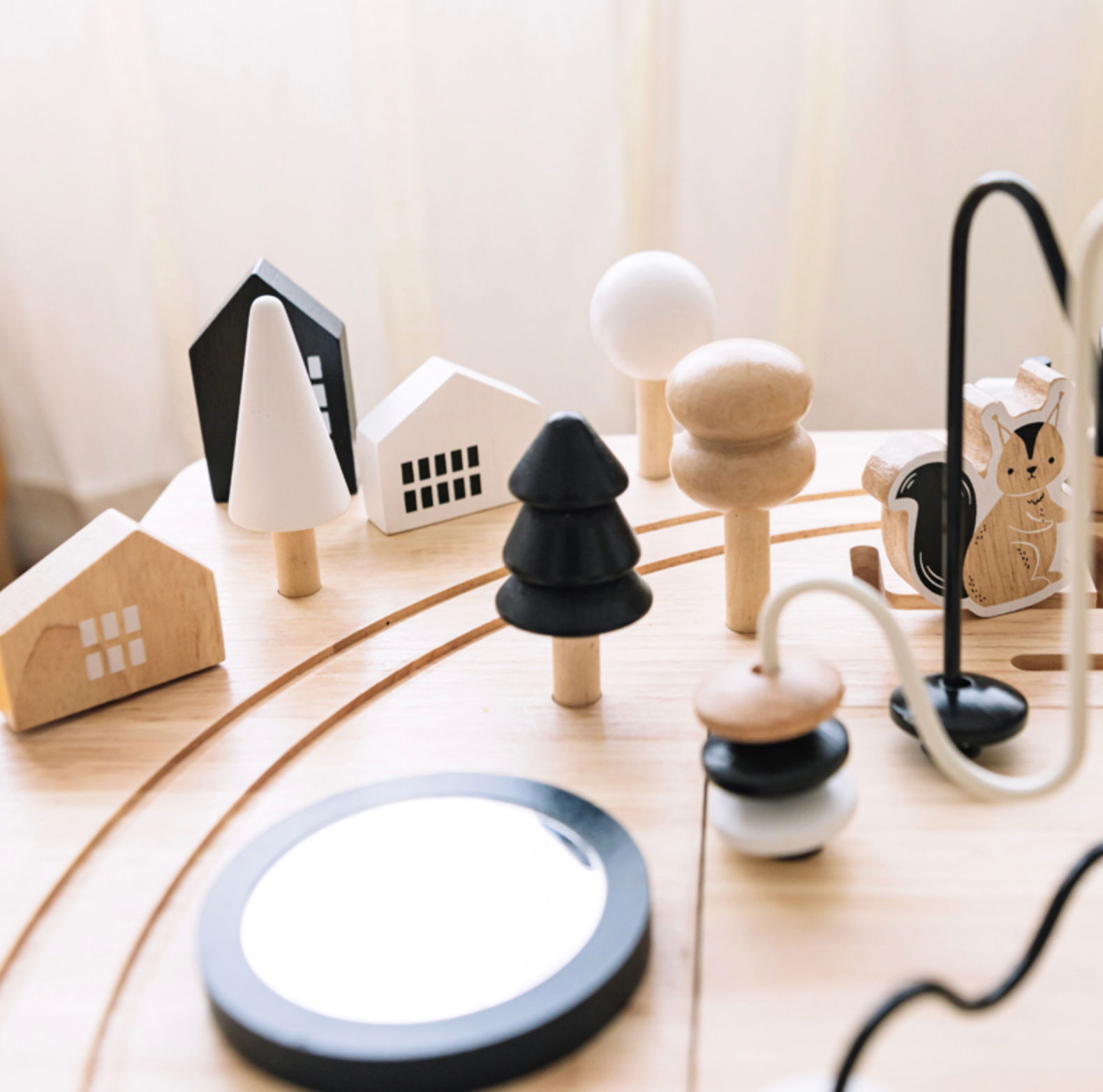 The busiest babies love our Activity Table. It’s loaded with lots of fun stuff including 3 removable stacking toy animals, a xylophone, puzzle, train set, and so much more. The center maze pulls up to reveal a cotton storage bag to keep things tidy. Legs screw on and off easily to hide away under a bed or in a closet. Great for babies learning to stand. Neutral design fits into any room, and will delight your little one for hours! Rubberwood, cherrywood, non-toxic water based paint, and 100% cotton bag add to the quality of this wonderful toy.
