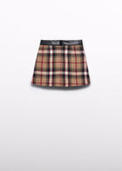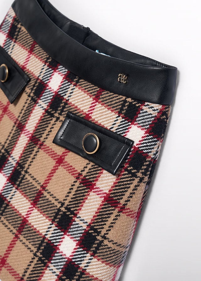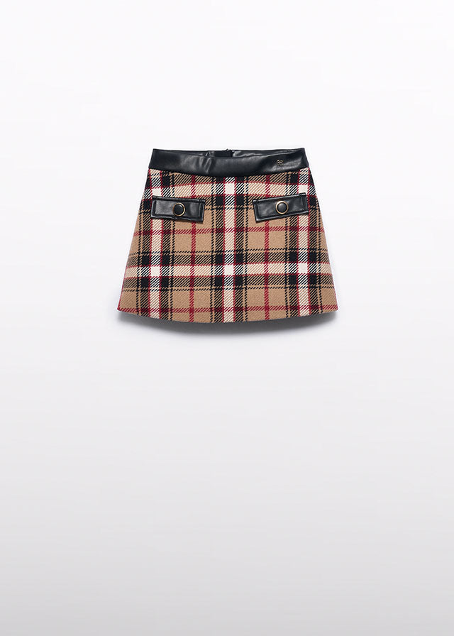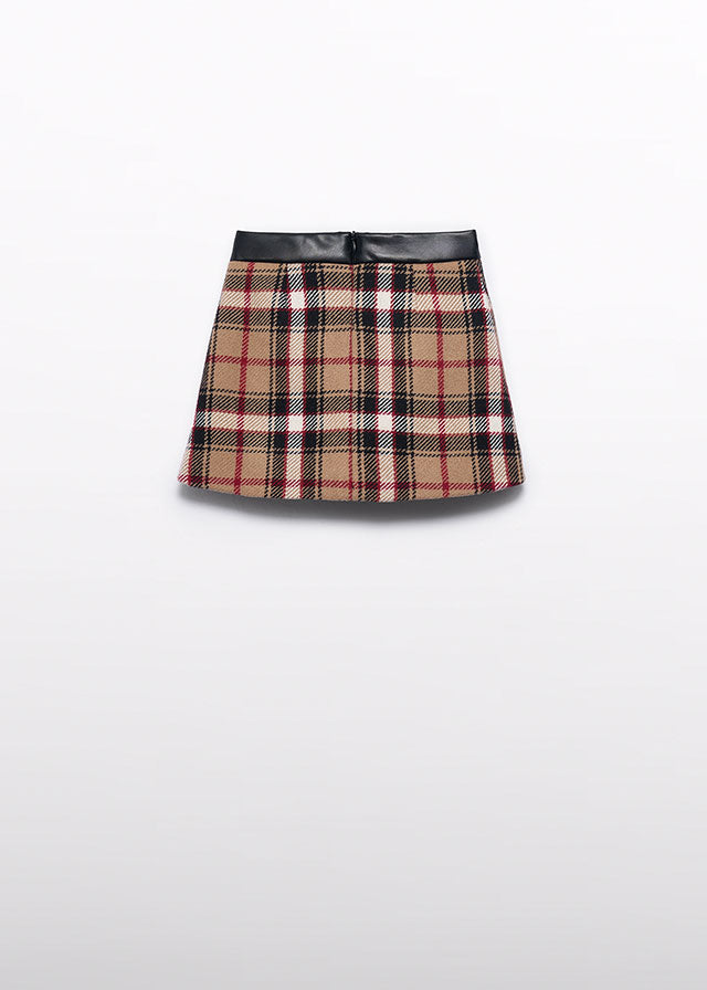 Elevate your wardrobe with our Camel Plaid Skirt, featuring a sleek black leather waistband and mock pockets. The beautiful brown and red plaid design adds a touch of sophistication to any outfit. Indulge in luxury and style with this exclusive skirt.