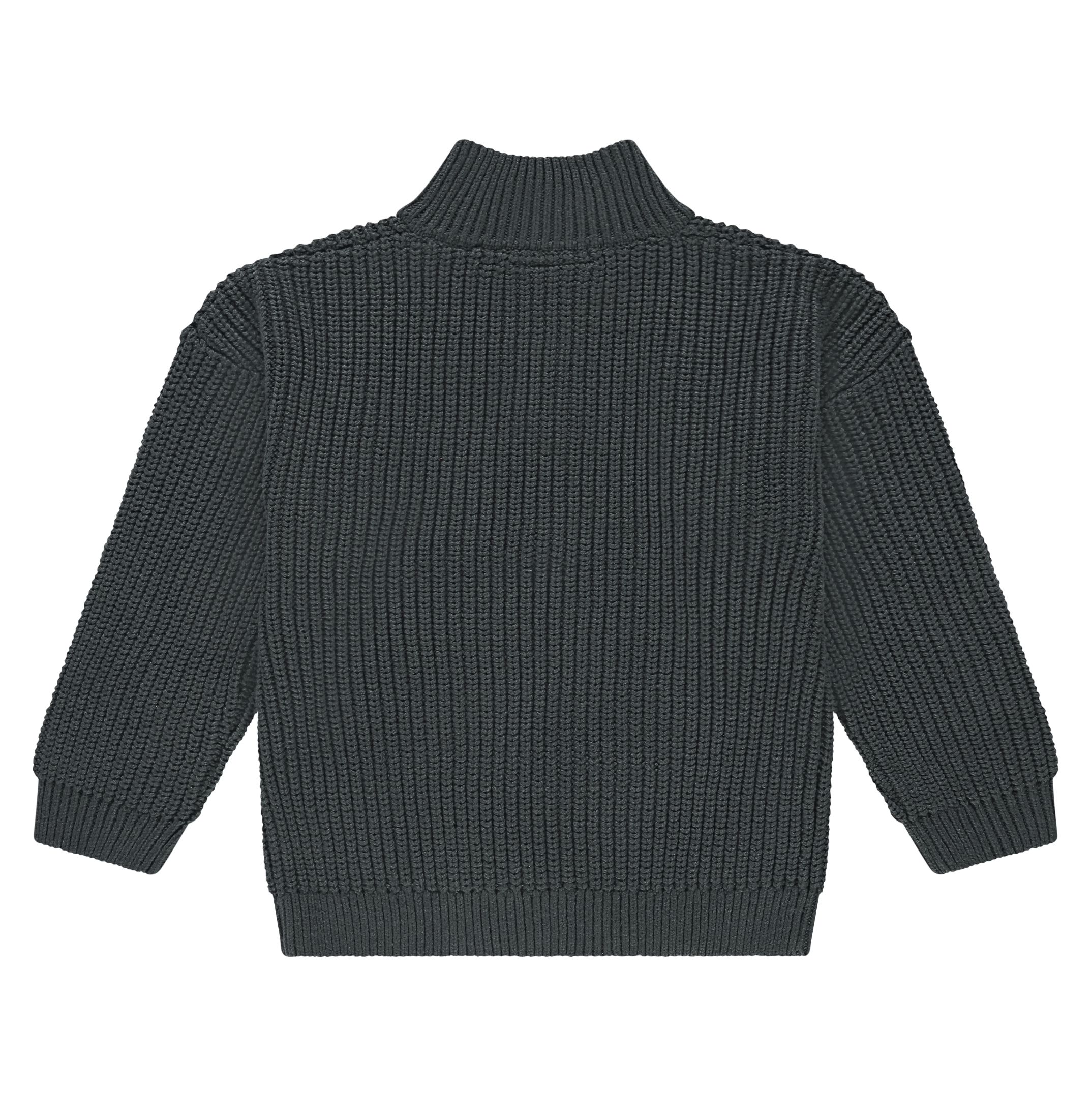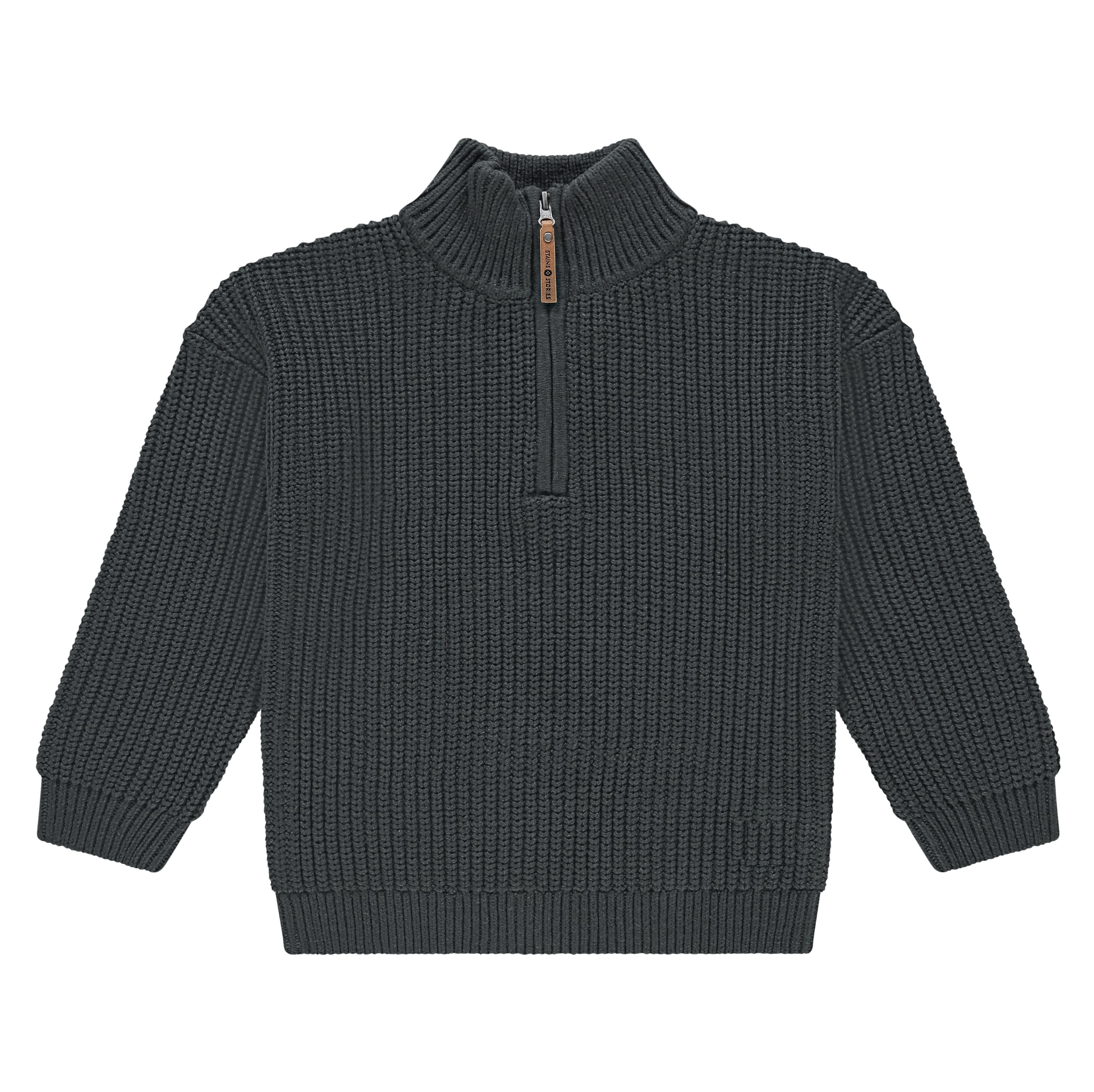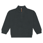 This dark blue pullover rib knit quarter zip sweater features a short zip enclosure at the neckline and a mock collar making for a chic wardrobe addition.