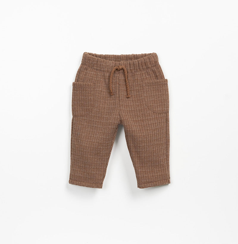 These jersey pants are made from a mixture of cotton and recycled polyester, Firewood color. The model has an elastic waist, a decorative drawstring, and side pockets.