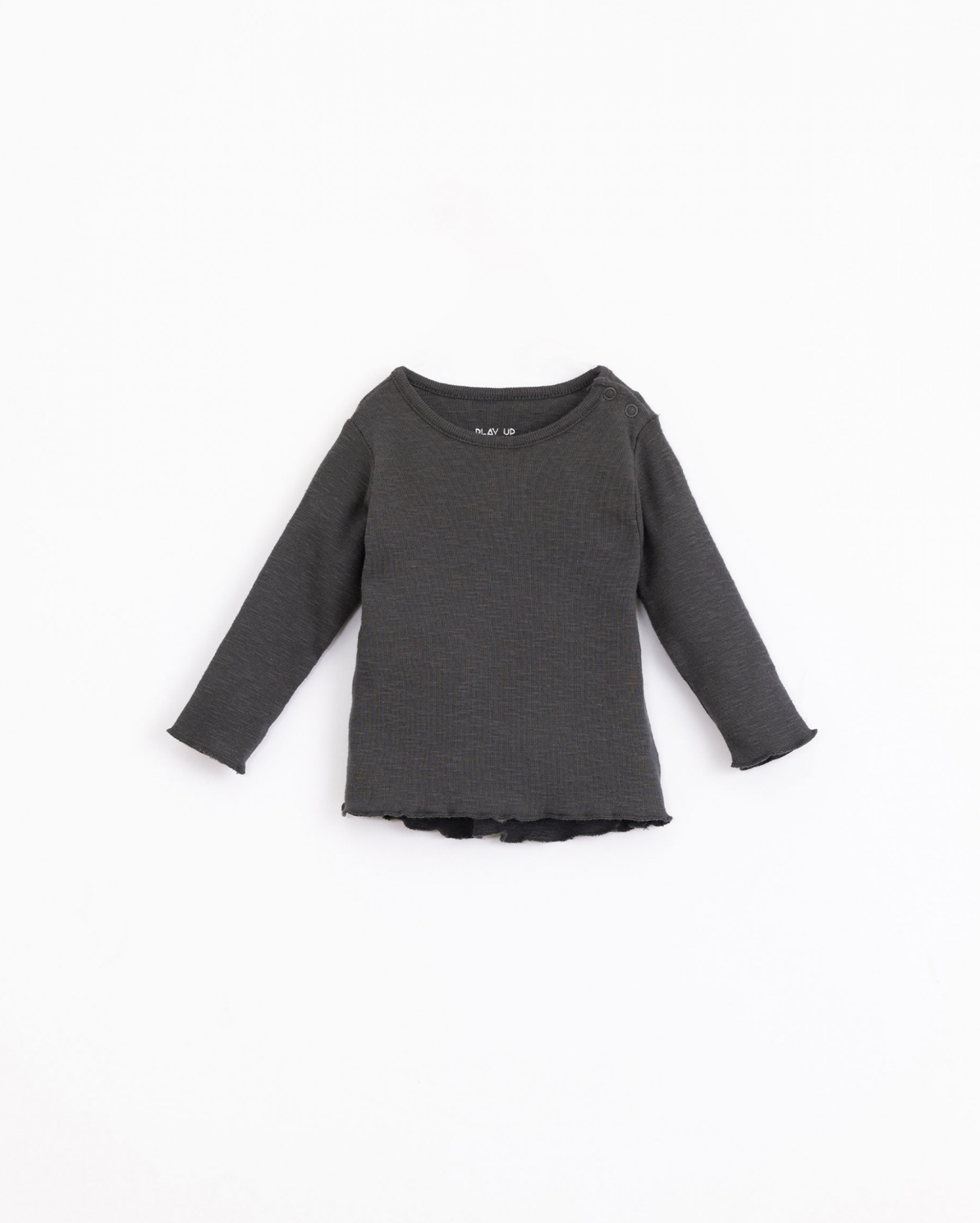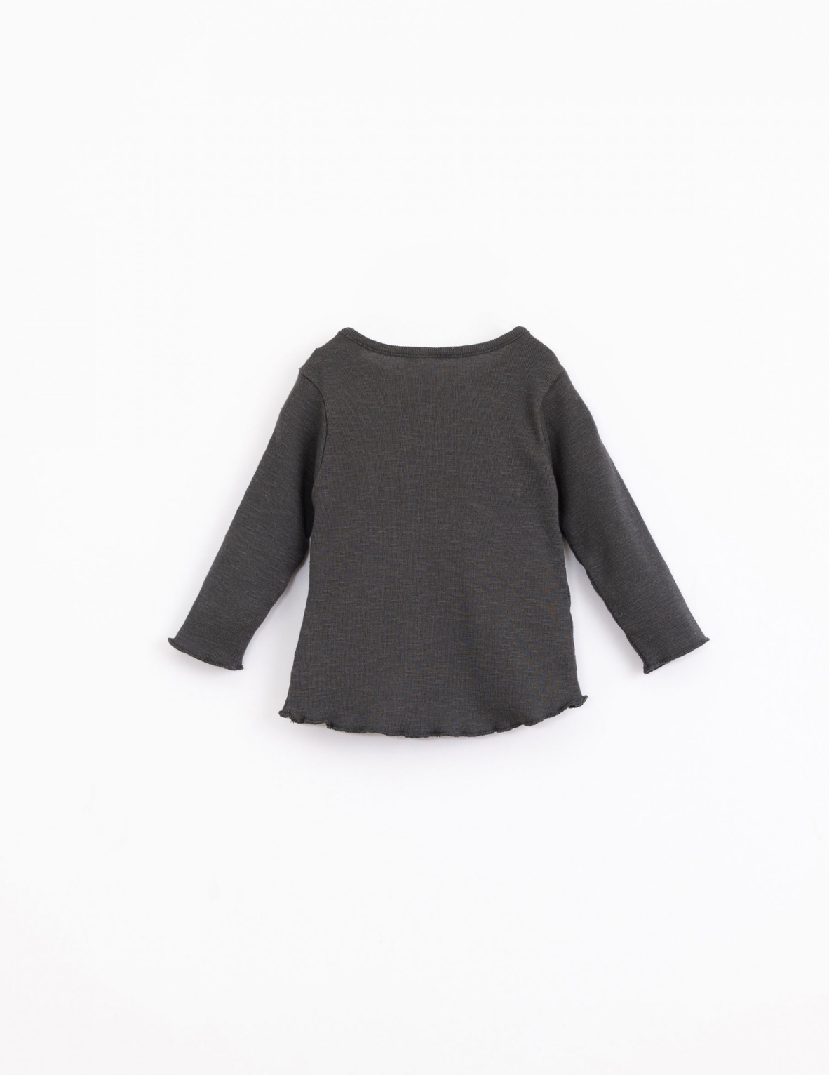 This t-shirt is made of jersey stitch organic cotton, Frame colour. The model has long sleeves and a round neck and an opening on the shoulder with nickel-free metal clips and the back is longer.