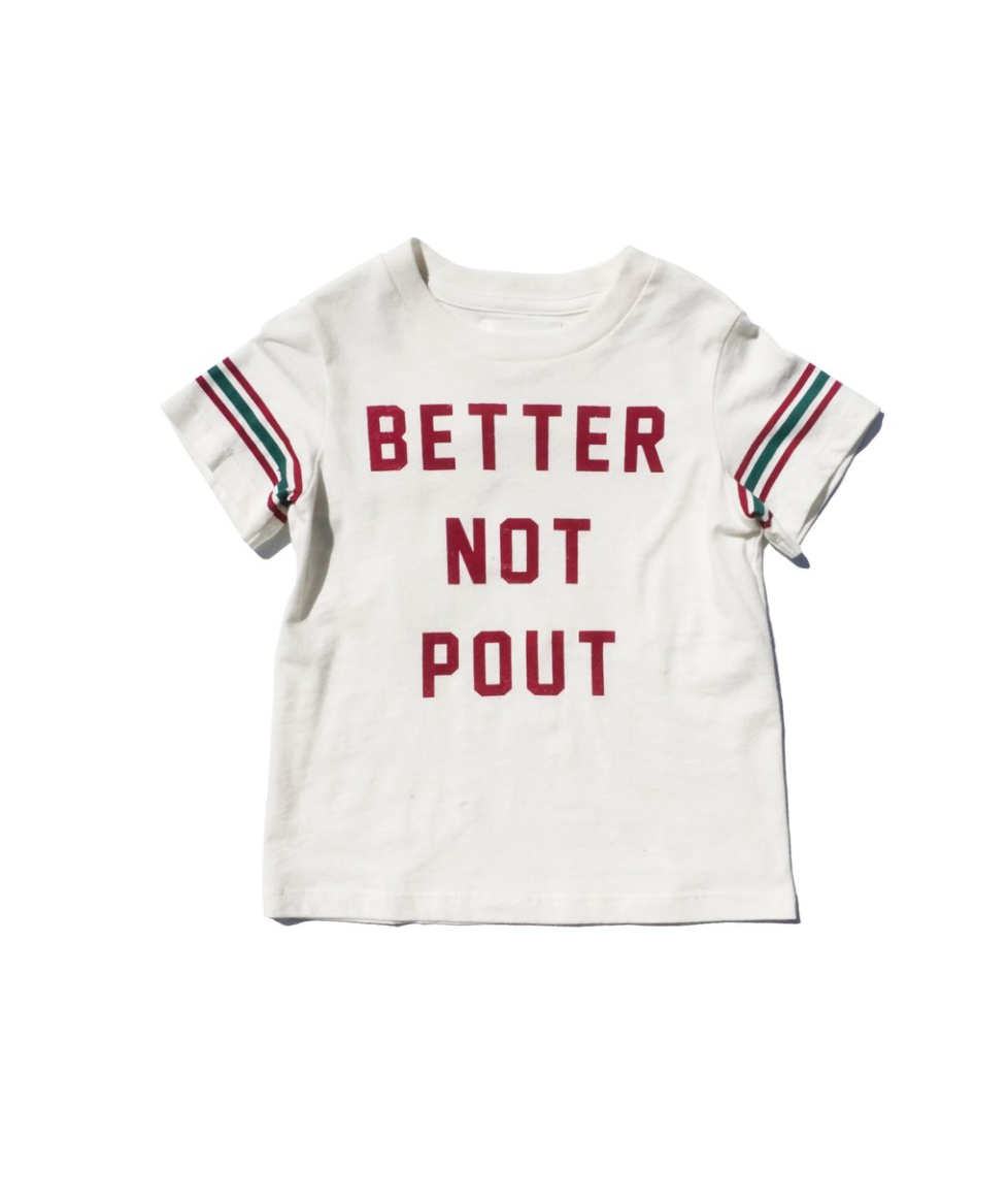 The bold holiday graphic features retro striped sleeves printed on a classic crew neck tee in Vintage White.