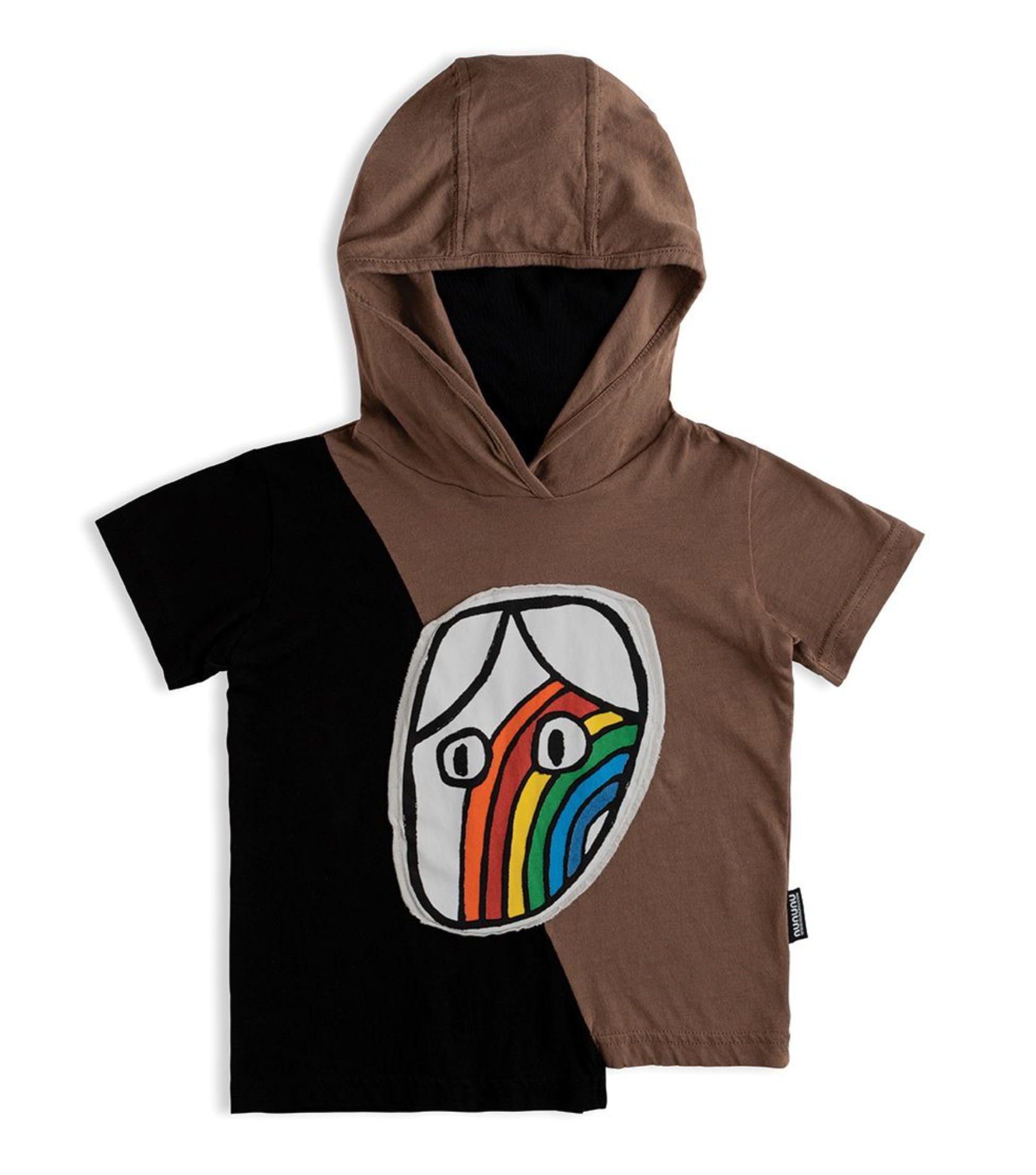 you may have heard; face covering is all the rage right now. but see, we’ve been up on this trend for years. and now, our o.g. ninja shirt doubles as a public safety measure with major style. the cover is easy to pull on any time and can be worn with the hood down or in full stealth mode while the eyes keep a lookout. this diagonal color block black & earth brown hoodie t-shirt has short sleeves to keep it cool for summer, with our giant “rainbow dude” patch on the front—a collaboration with artist shay id alony.