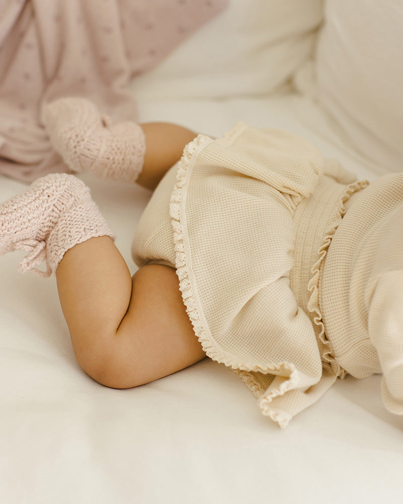 Add a touch of charm to your little one’s wardrobe with our Skirted Bloomer. Crafted from lightweight waffle fabric and finished with delicate lace trim, it pairs perfectly with any top for an effortlessly sweet look.