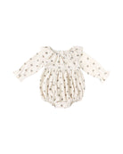 Longsleeve velour romper with gathered waist, ruffle collar, and lace trim details at neckline and cuffs. Snap closures along the inseam for easy changing.