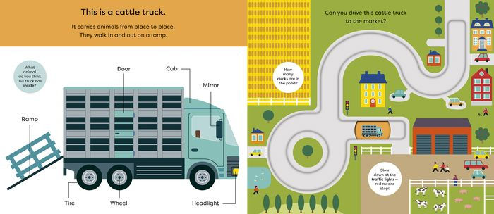 Discover things that go in this chunky new Make Tracks board book, and trace each vehicle's path around the farm. In this interactive series with easy to use, durable sliders, your toddler can operate a tractor, a combine harvester, a cattle truck, and an ATV!