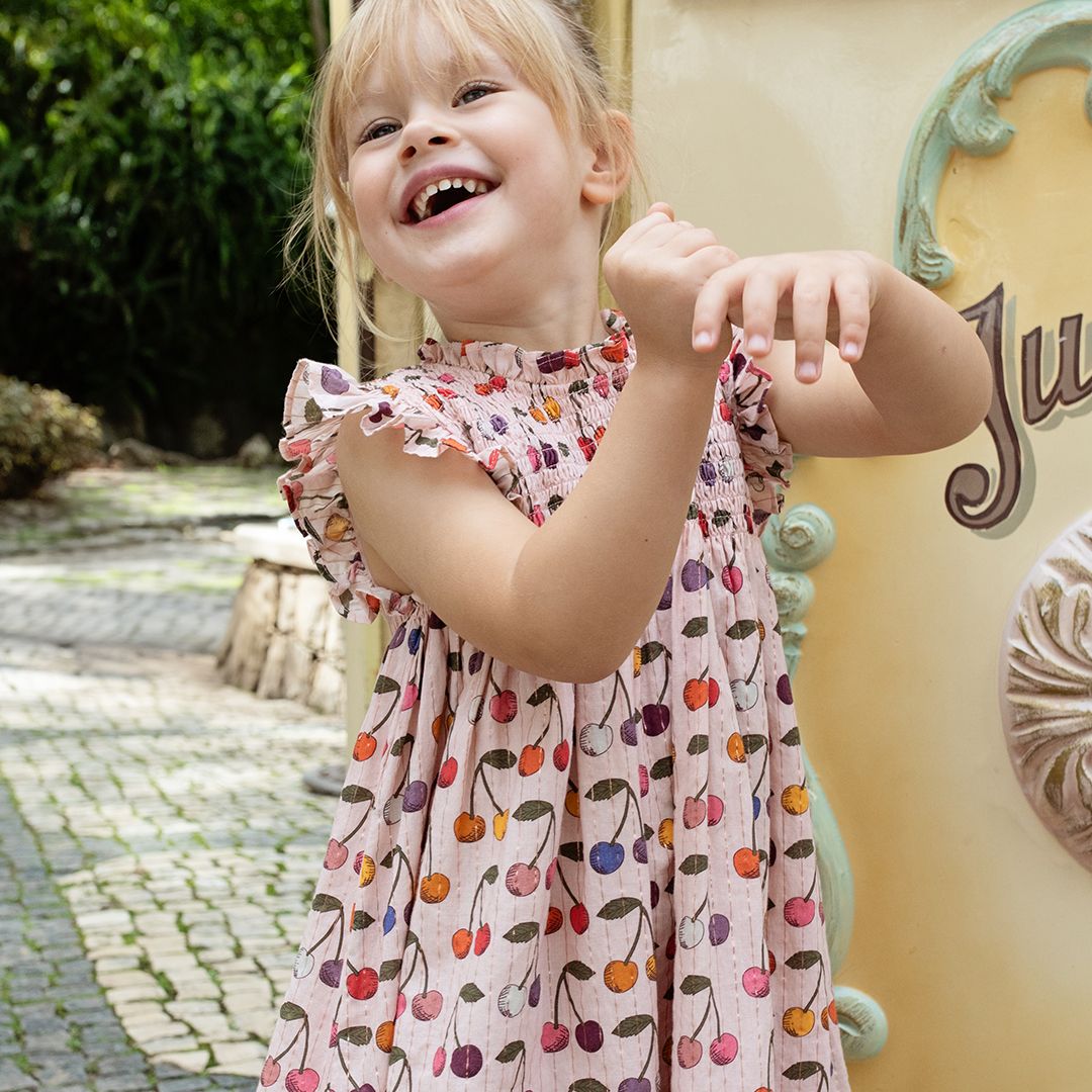 Cherries On Top! A colorful array of cheery cherry twins, on a pale pink ground, sweetens our flock favorite Baby Girls Stevie Dress Set, in Cloud Pink Cherry. This much loved silhouette stands out with its fluttery ruffled arm and delicate ruffle at the neck and vintage inspired smocking at the chest and matching elastic waist diaper cover. Invisible zipper closure at the back. Match back to Big Sis in our Girls Stevie Dress for a ripe-for-cuteness twinning moment.
