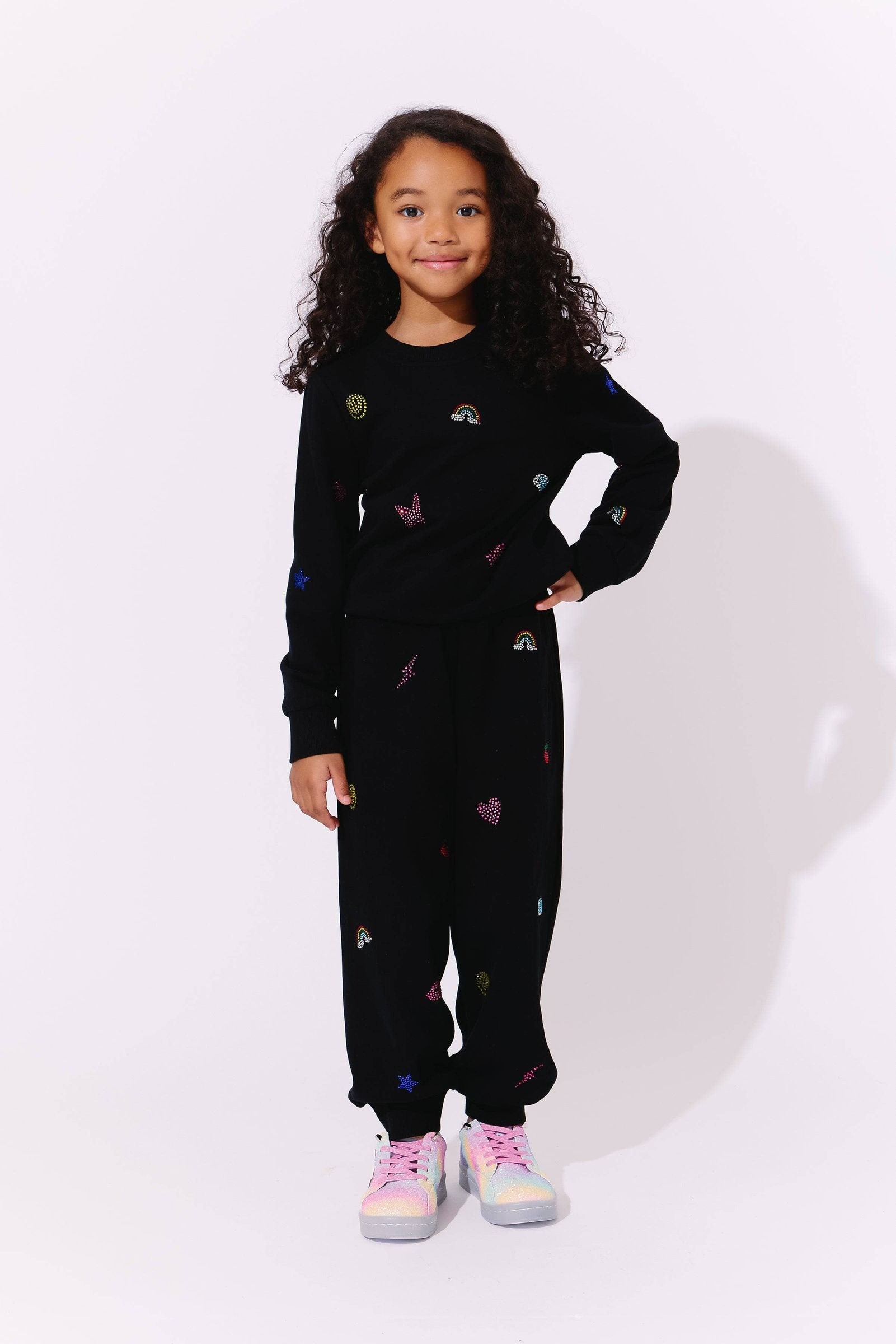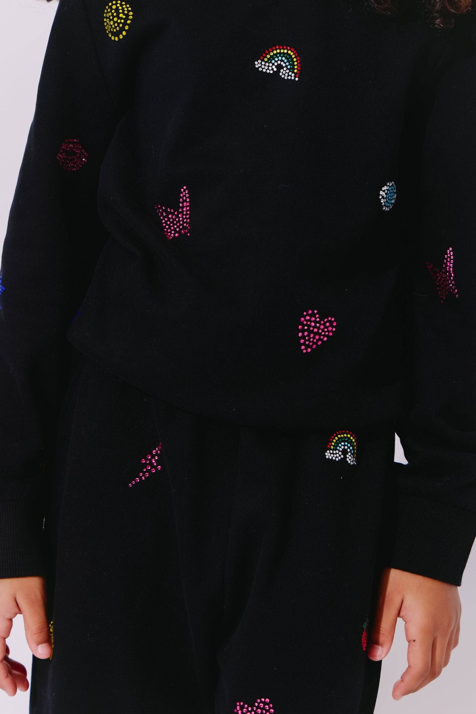- Fun and playful doodle patterns made from colorful crystals add a pop of sparkle to a classic black set.