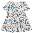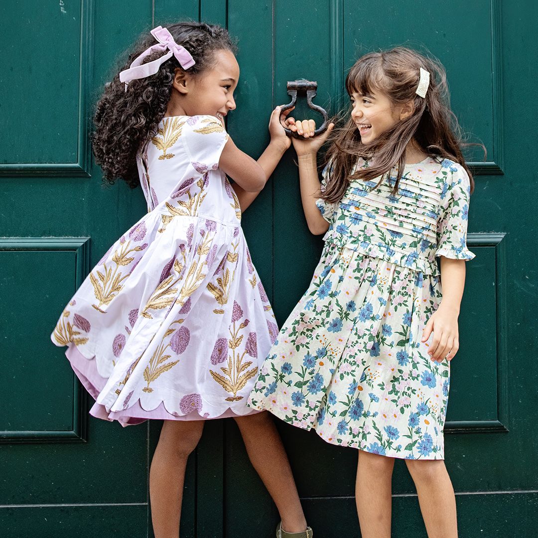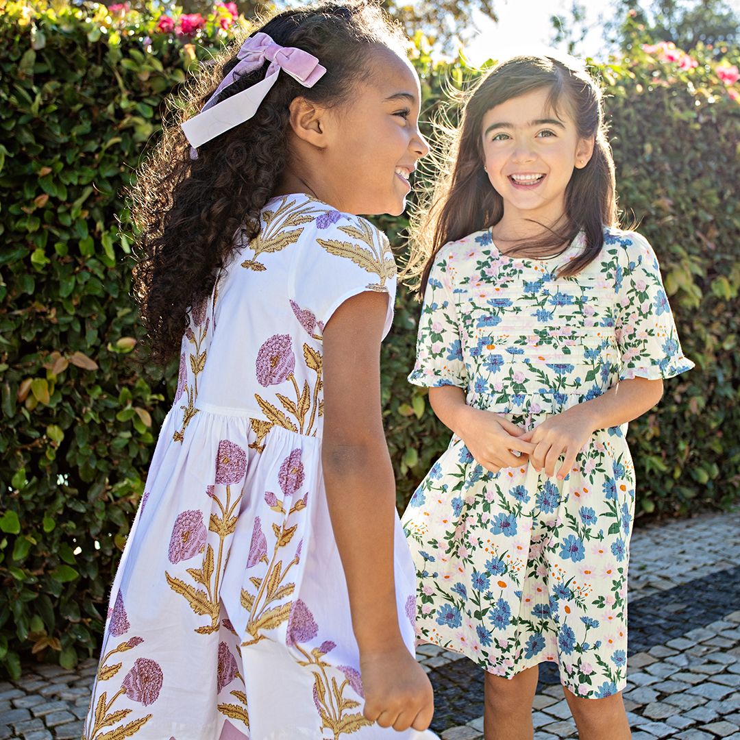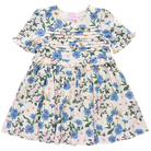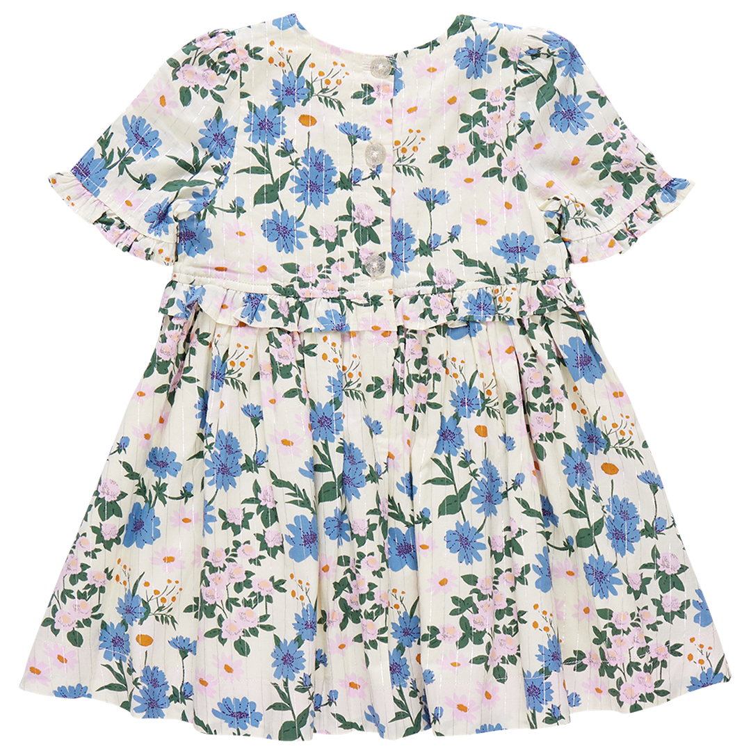 Fresh As A Daisy! A patch of wild daisies in shades of cornflower, pale pink and white springs from a white ground in our Melon Daisy Floral shown here on our short sleeve Girls Raquel Dress. Designer details on this new-to-the-collection silhouette include a pattern on pattern ruffle detail at the sleeve and waist, a vintage-inspired pintucked chest and our signature glitter button back closure adds. A shimmery silver thread woven throughout the piece adds a subtle sparkle. Match back to sister in our Girls Gianna Skirt or Baby Girls Jennifer Jumper in Melon Daisy Floral for a nostalgic look.