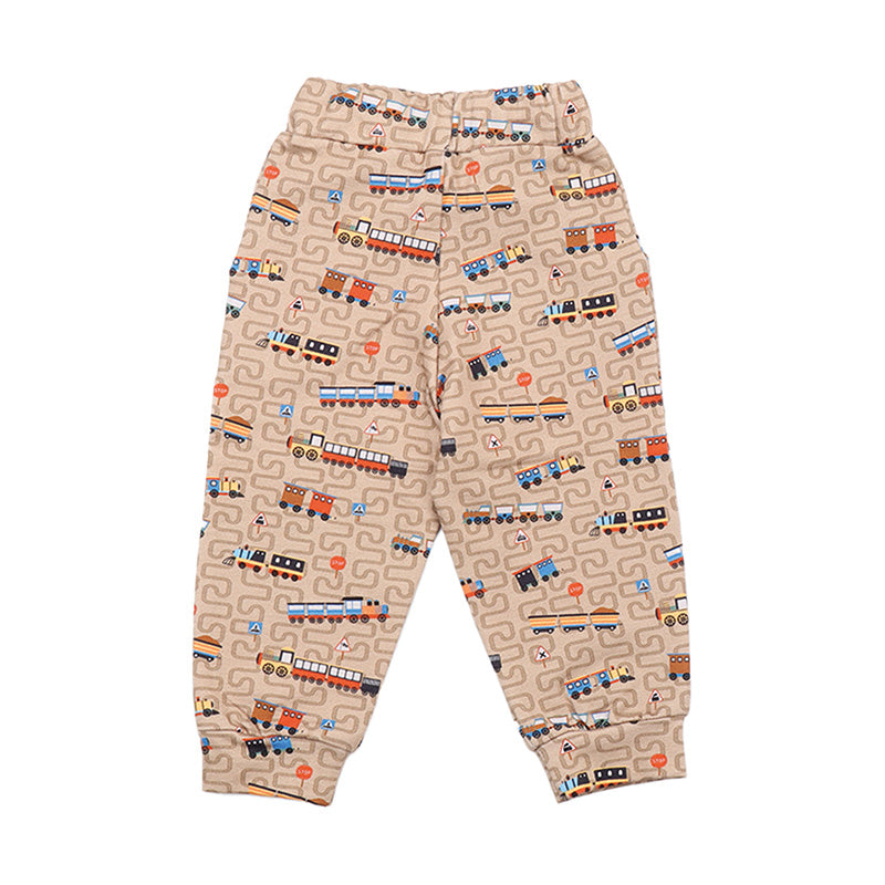 Walkiddy baby baggy pants in tiny trains print on beige organic cotton. Pockets, elasticated waistband and drawstring.