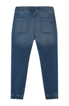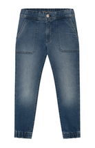 Blue bayou is a clean mid indigo wash with an elastic waistband and hem. It features patch pockets, tonal stitching, and brushed silver hardware.