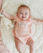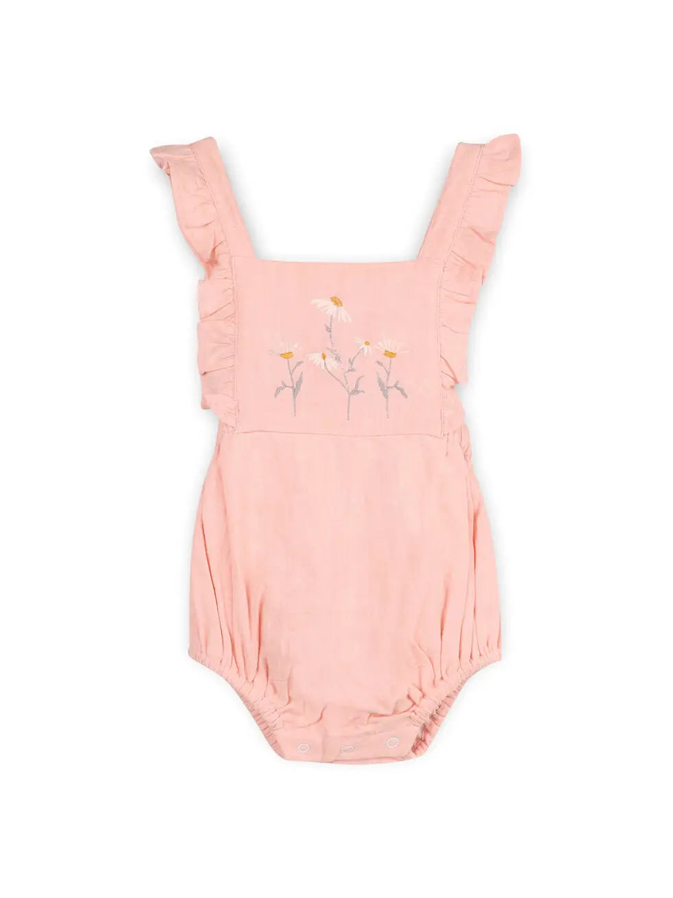 The Daisy Linen Blend Embroidered Romper is crafted from a luxurious 100% natural woven soft linen blend renowned for its breathability and gentle touch against delicate skin. This romper exemplifies heirloom quality, designed to be treasured and passed down through generations.