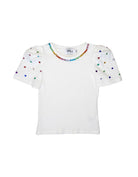 - Elegant and Fun: Ribbed white tee embellished with vibrant rainbow gems along the neckline and sleeves for a sparkling touch.