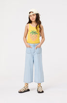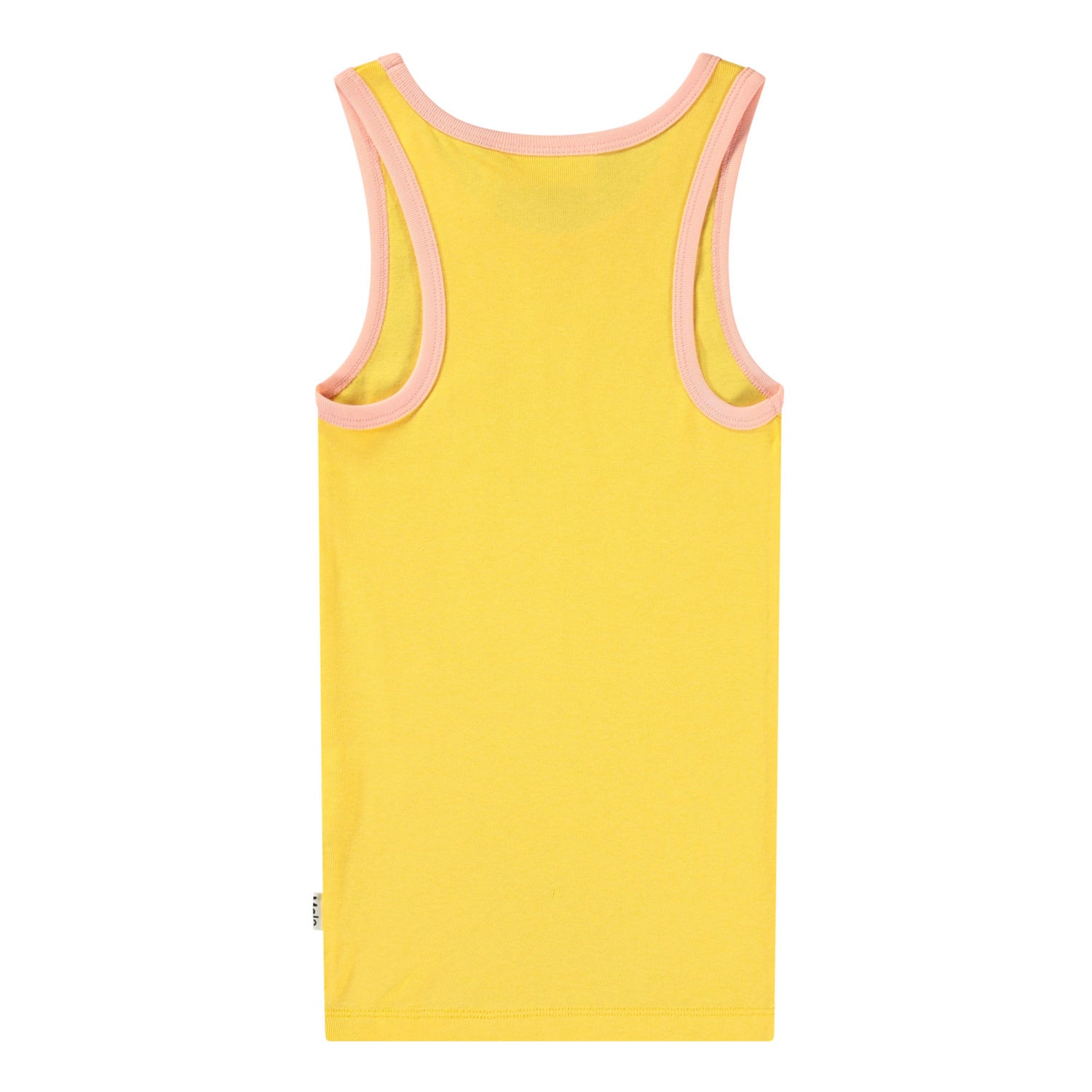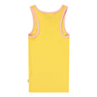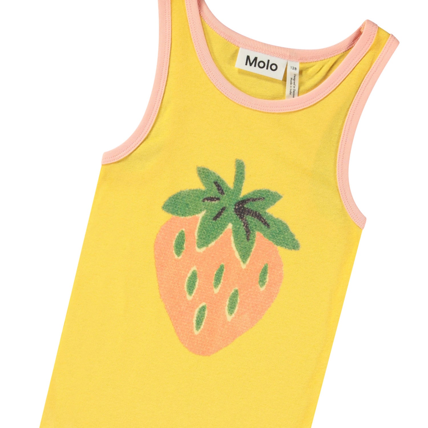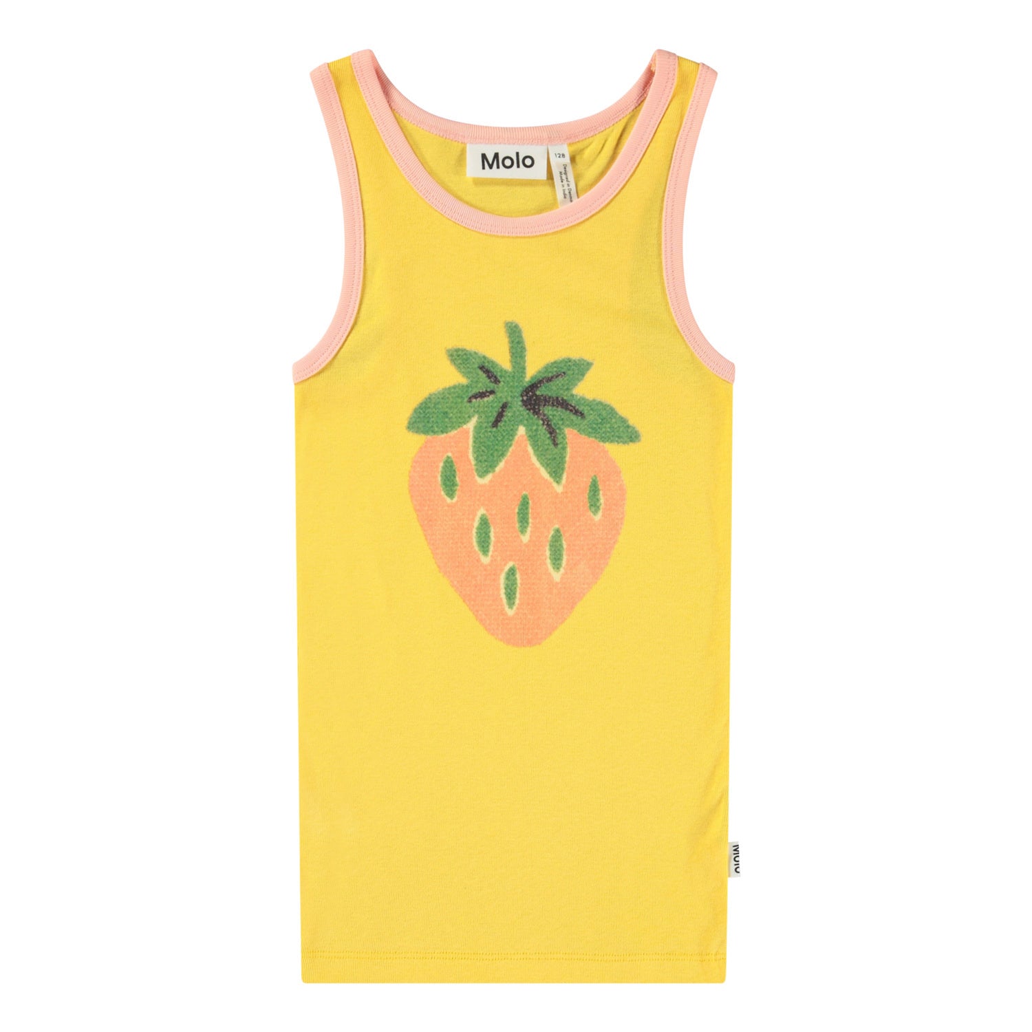 Yellow, snug tank top in organic cotton. The top has a light peach edge tape around the neck and armholes, and it has our iconic straberry printed on the front.