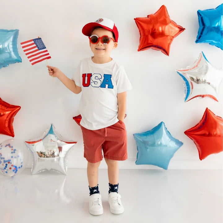 The USA Patch Short Sleeve T-Shirt is a fun and festive t-shirt for kids celebrating the 4th of July or to show patriotic spirit any day!