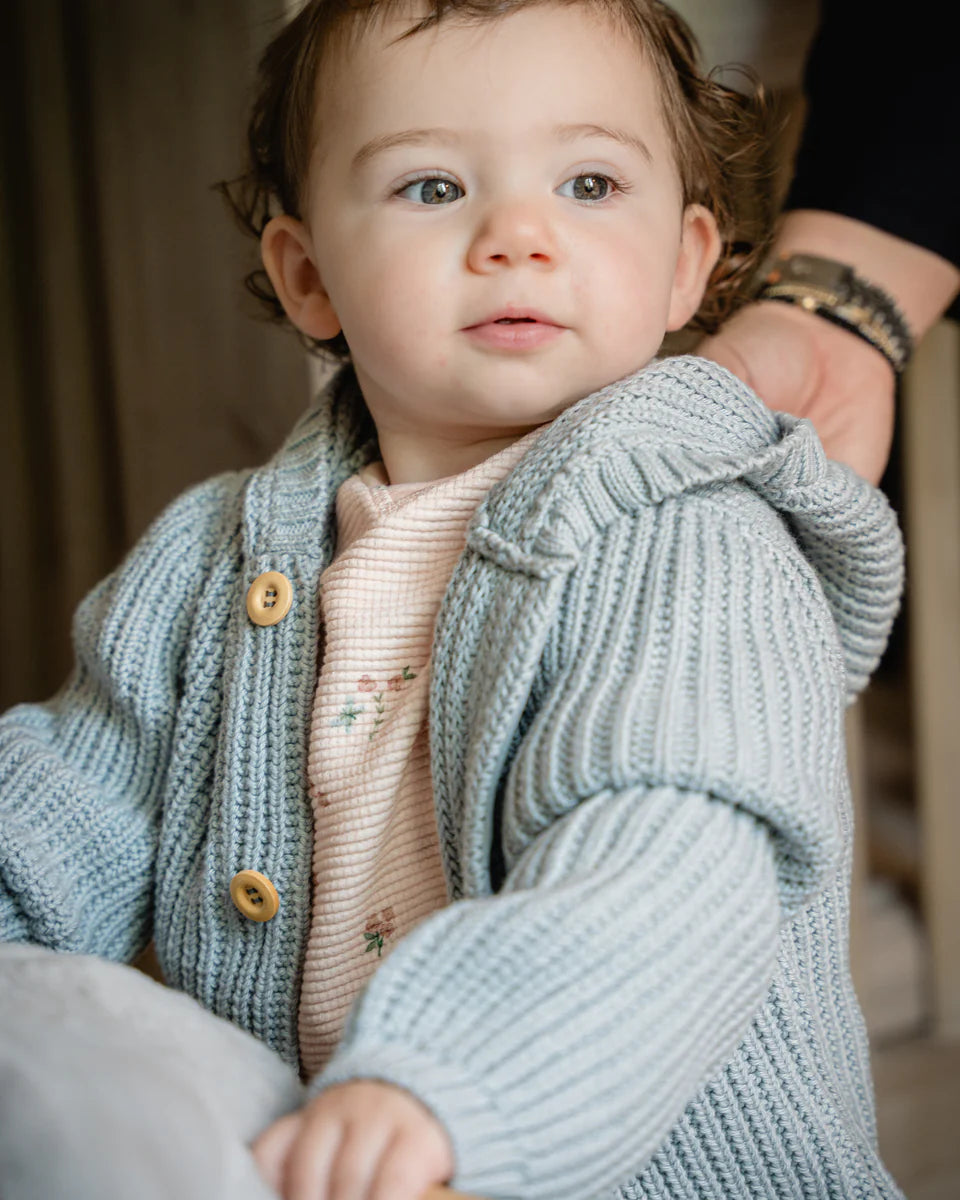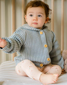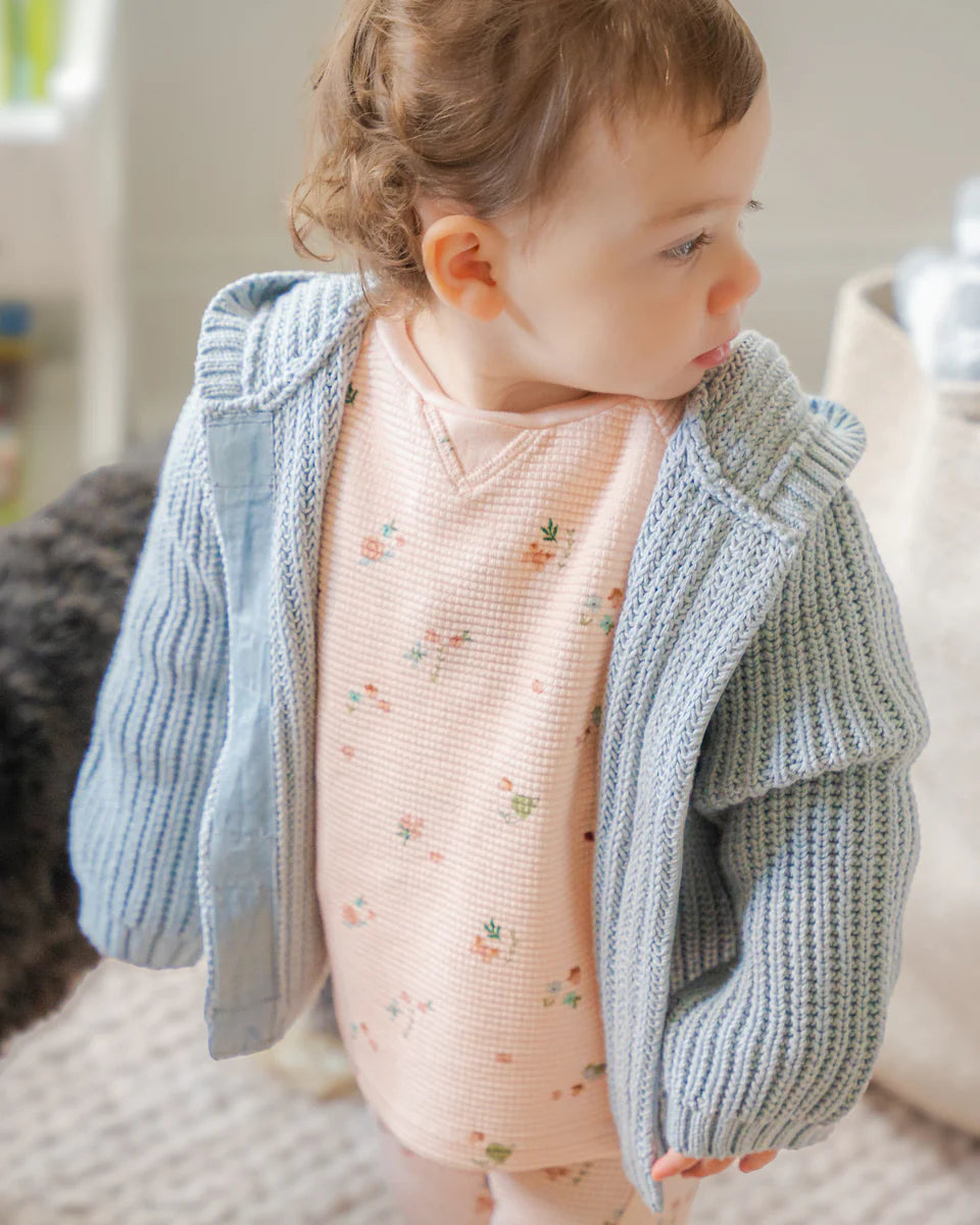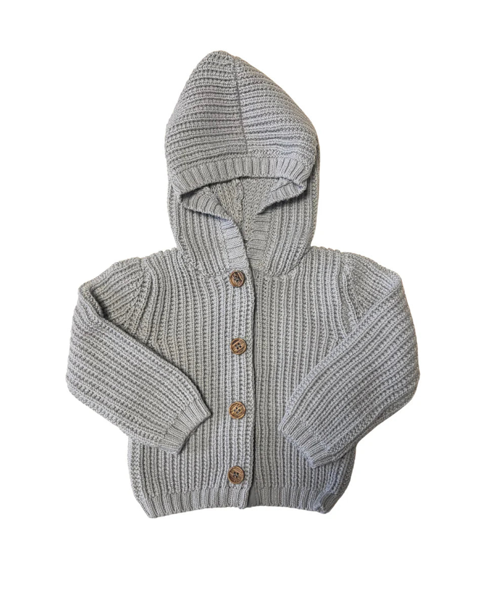 Our pima cotton knit hoody cardigan is an essential for your little one's fall and winter wardrobe. Made with the softest Pima Cotton yarns from Peru in an adorable chunky waffle stitch. The cardigan features a fun hood as well as Magnetic Buttons all the way down the front placket for easy changing. It is the perfect layering piece that will match any outfit! Intentionally designed to be gender neutral.