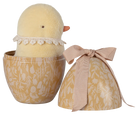 A sweet soft plush chicken with a vintage cotton collar around the neck, packed in a lovely metal egg with a beautiful print and a big soft bow on top - a perfect gift for the small ones.