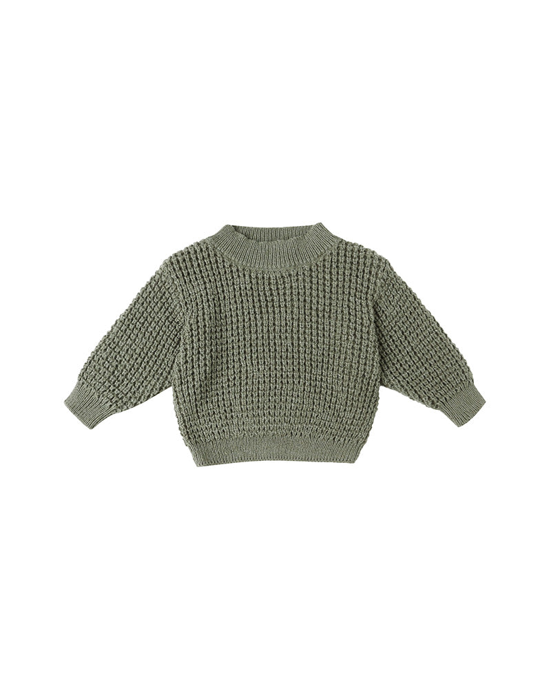 Adorable chunky knit sweater with ribbing at the sleeve and neck openings.