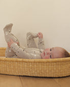 Full double-zip footie crafted from our soft and stretchy bamboo fabric. Fold-over hand mitts included on sizes NB – 3-6M. Raised screen print on soles of size 6-12M for added traction.