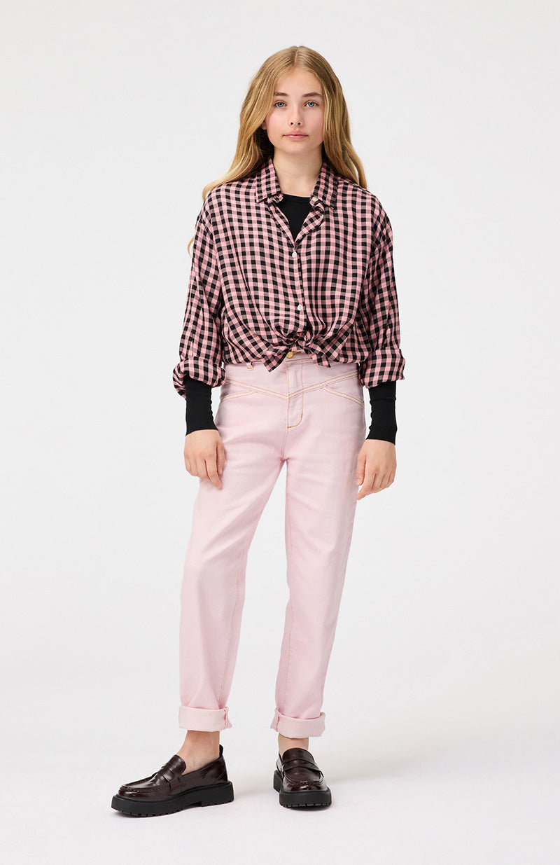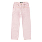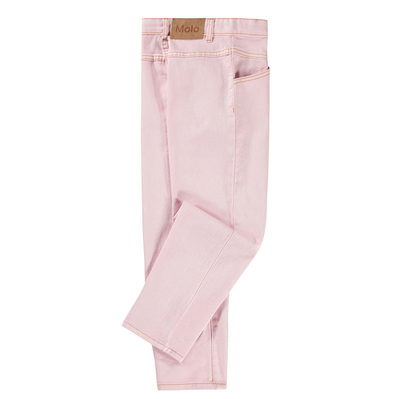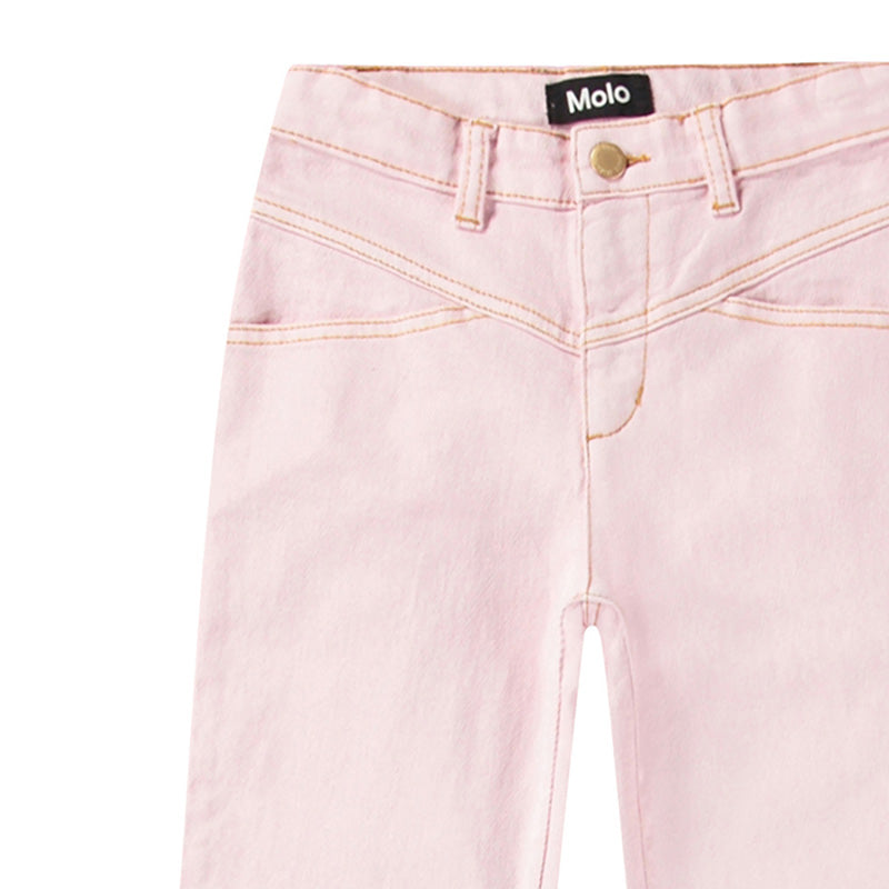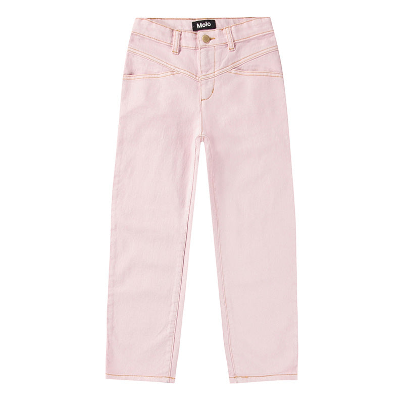 Pink denim jeans with copper stitching. These jeans feature delicate stitching on the front and two side pockets.The waistband of the jeans can be adjusted with an internal elastic, ensuring a perfect fit for all children. Sizes 92-134 have a snap button, making it easy to take the pants on and off, while sizes 140-176 have a regular jeans button.