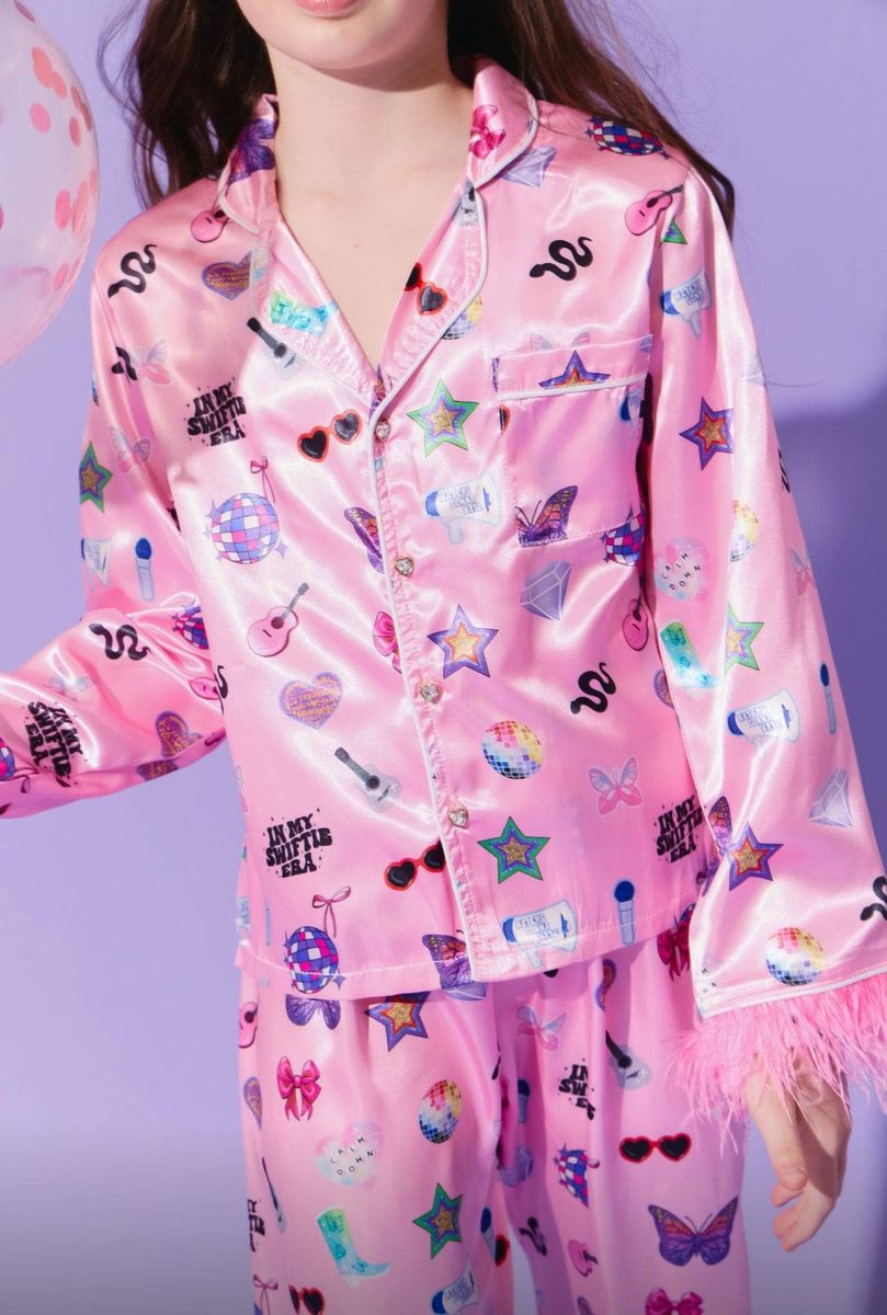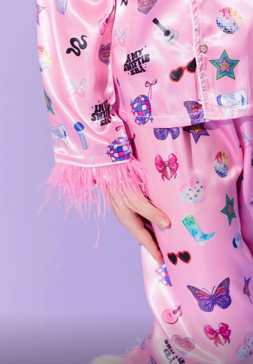 - Glamorous two-piece silky set featuring a vibrant Swiftie-inspired print with stars, hearts, and iconic motifs.