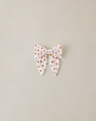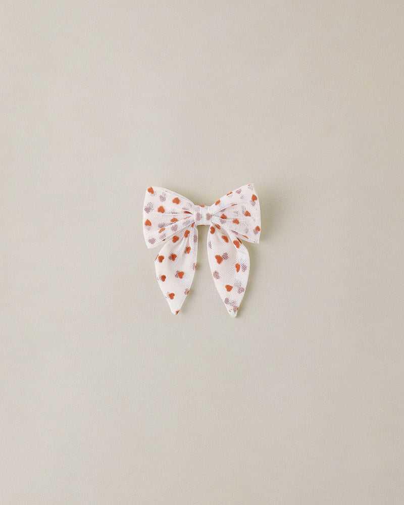 A flocked heart tulle bow attached to a rose gold alligator clip for easy wear.