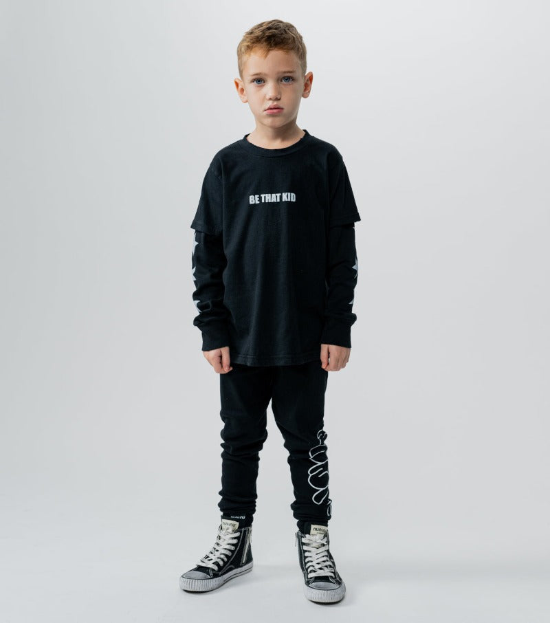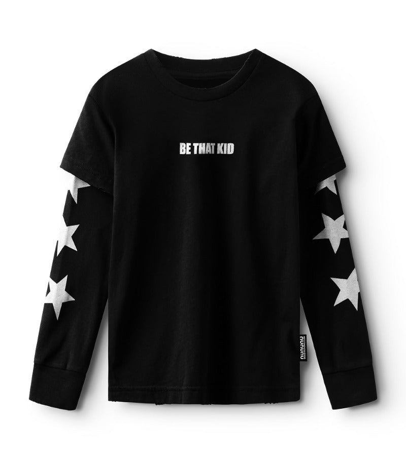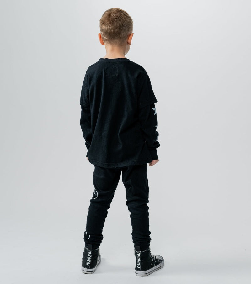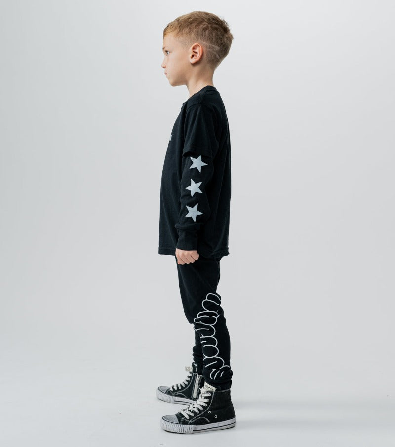 finally a shirt that is as outspoken as the kid wearing it. this gender neutral fit is made of super light black single cotton with custom deconstructed edges so it’s soft enough to contrast with their totally rock on personality. plus, it’s got black rib sleeves decked out on both sides with stars because they are one. it screams be that kid on the front to explain to the world that this kid is independent, curious, and never afraid to stand out.