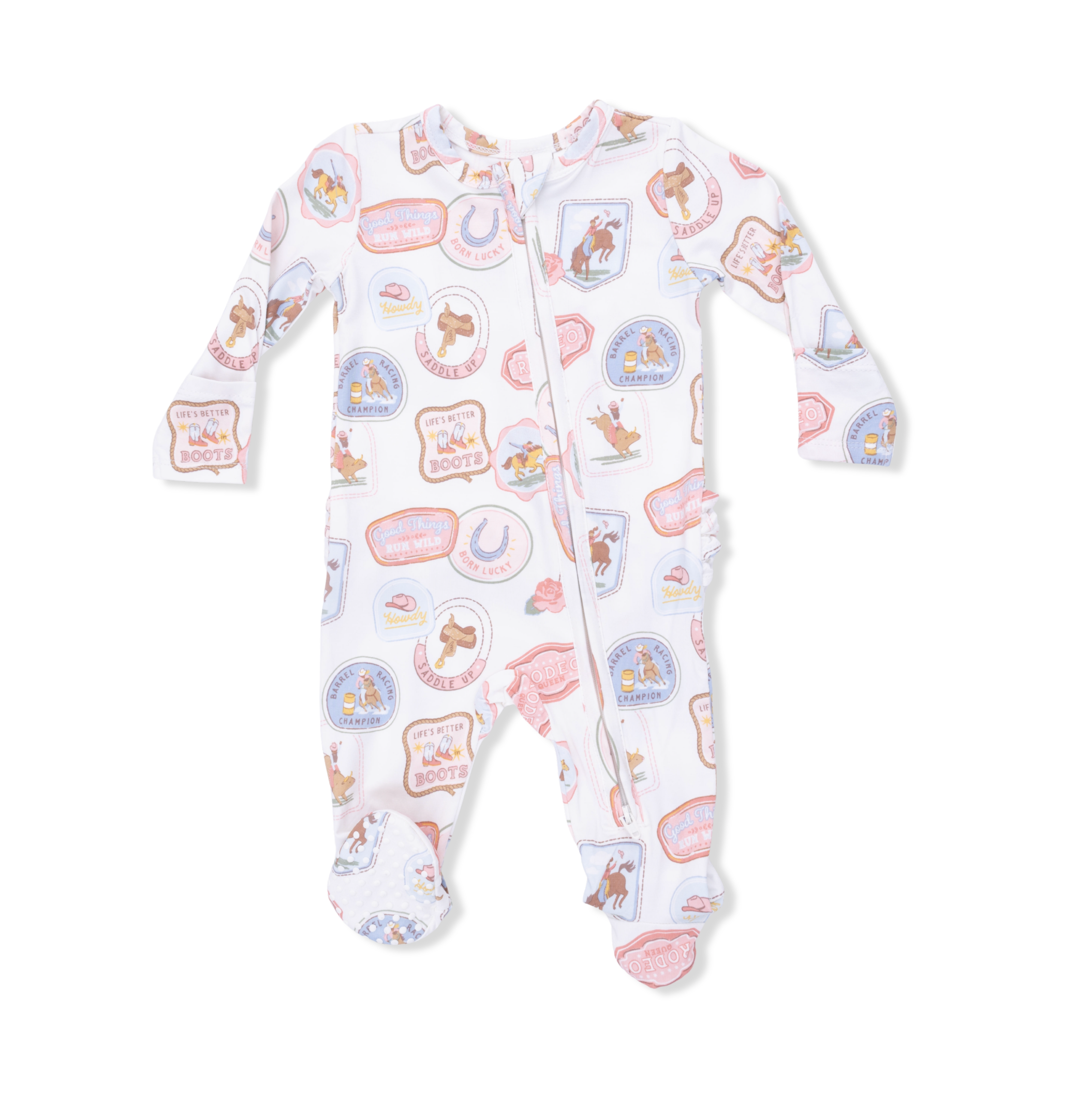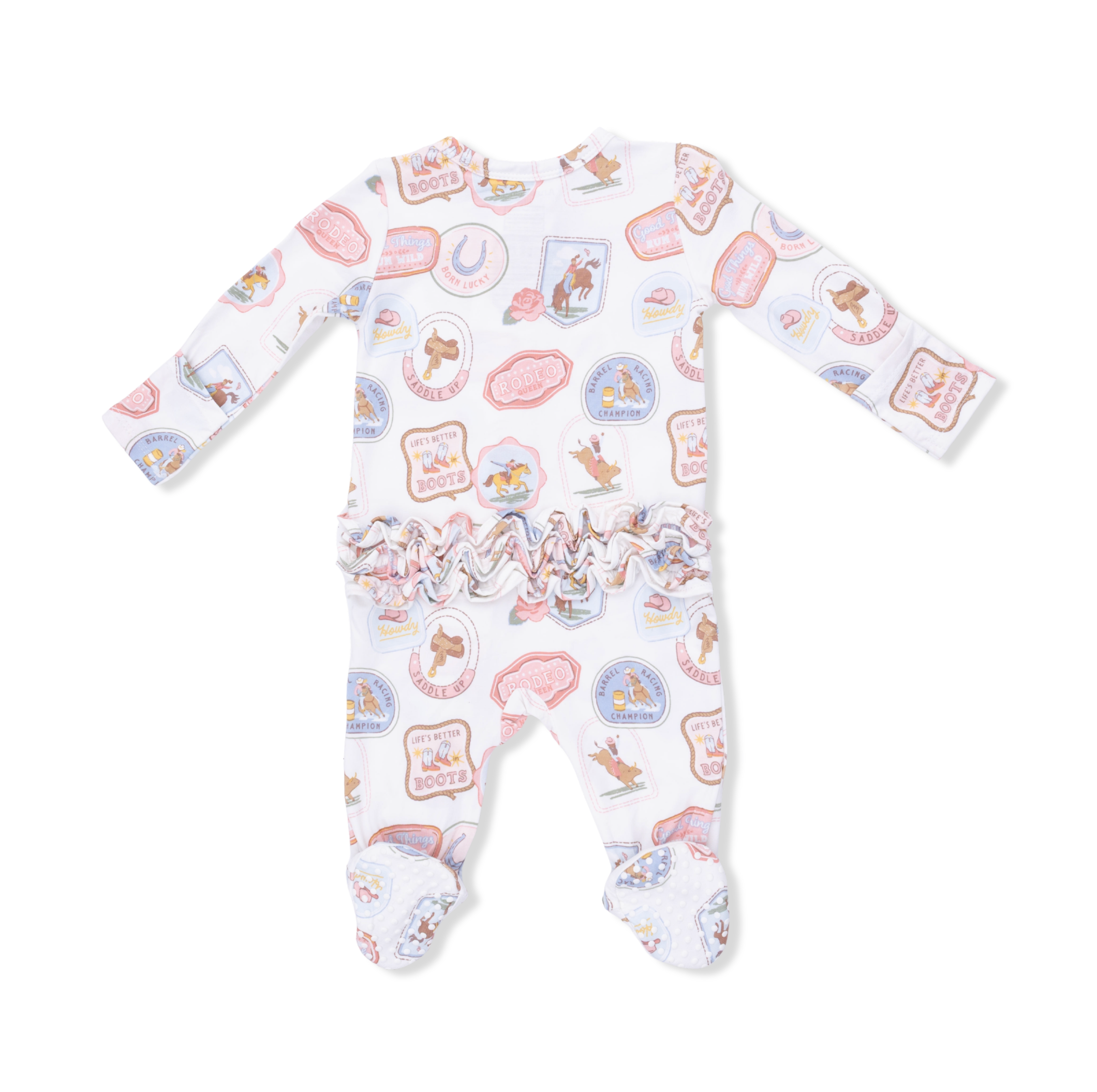 2 Way Ruffle Back Zipper Footie - Rodeo Patches Pink