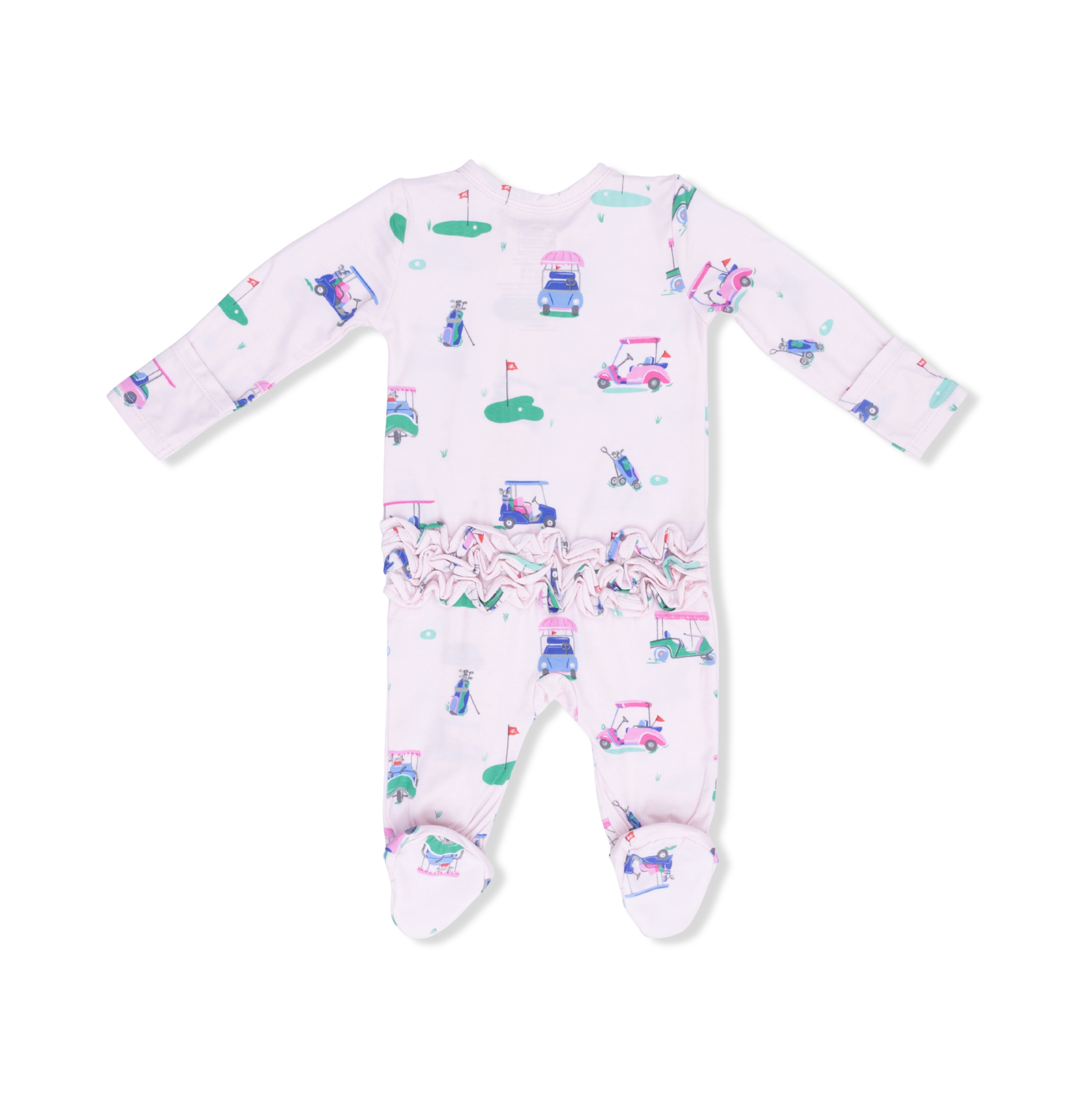 2 Way Ruffle Back Zipper Footie - Vintage Golf Carts Pink
