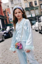 - Elevate your wardrobe with this enchanting sky-blue set, featuring feathered cuffs for a touch of glamour and sophistication.