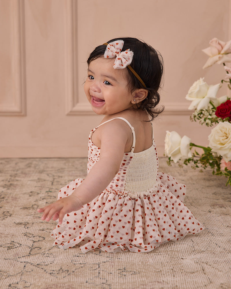 This sweet tutu style features a full tiered tulle skirt, a gathered bodice, and a print that's saying, "Be Mine!"