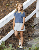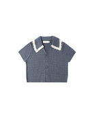 The pointelle Sloane Knit Top features a contrast knit scallop collar and faux shell buttons.