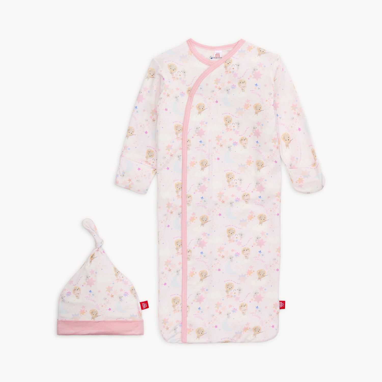 Our magnetic sack gown, featuring time-saving magnetic fasteners and no over-the-head design, will have newborns dressed in a jiffy while significantly reducing their exposure to the chilly air. Quick diaper access at the bottom of the gown for frequent night changes makes life easier for new moms and dads. Includes matching reversible hat. Pairs perfectly with coordinating blanket and bib to make the ultimate baby gift for parent and baby. Modal is certified as a 100% Bio-based fabric by the US Department of Agriculture, responsibly farmed from Beechnut trees.
