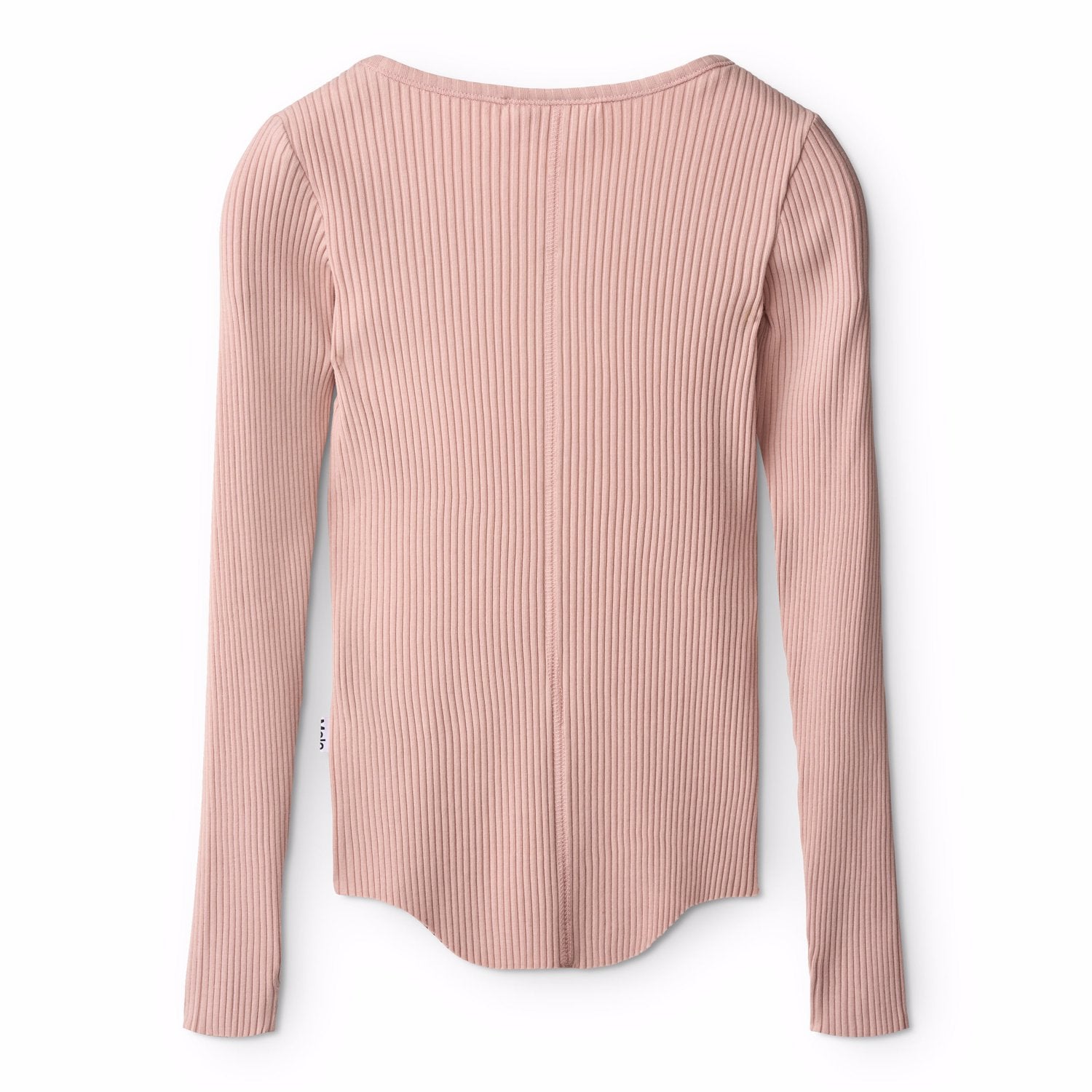Pink long-sleeved top made of stretchable organic cotton rib. The top has a close-fit, round neck, raw edges at the bottom and sleeves, as well as thumb holes.