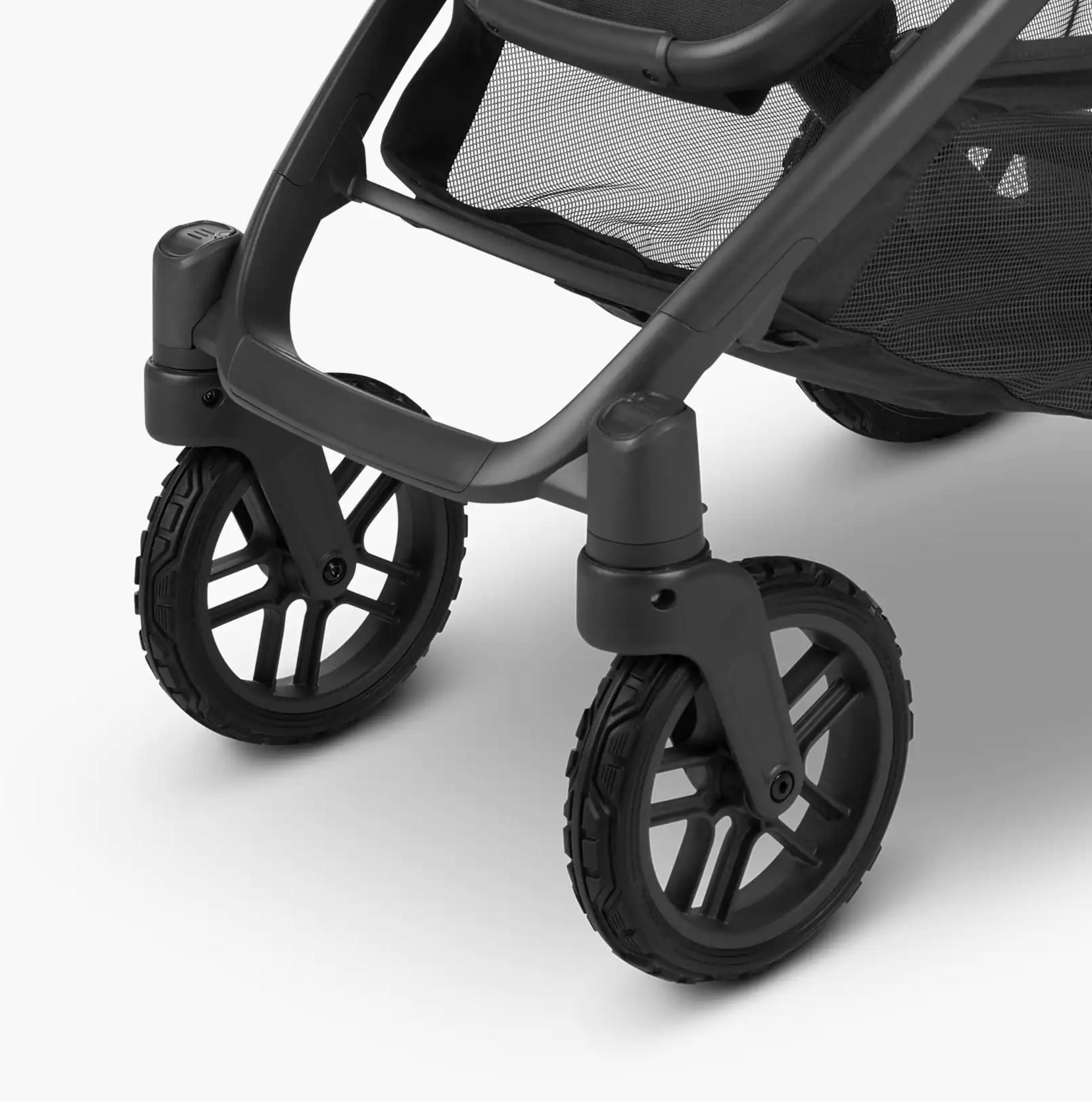 Introducing our pioneering All-Terrain Wheel Kit, carefully engineered to optimize the performance of your Vista stroller on challenging terrains. With four rugged, never-flat wheels and a convenient storage bag included, this innovative kit is thoughtfully designed to effortlessly navigate through snow, cobblestone, and uneven surfaces.