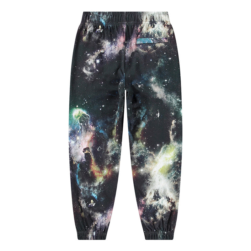 Multicoloured sweatpants in organic cotton with an all-over print inspired by outer space. The trousers have a regular fit, an elastic waist with an internal drawstring, elastic ankles, and side pockets. They have a brushed inner face, making them soft and warm to wear. The print includes freely floating satellites, which can be seen upon closer inspection.