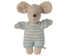 A small baby mouse in a soft and striped knitted suit. It sleeps for hours in its little quilted carry cot.