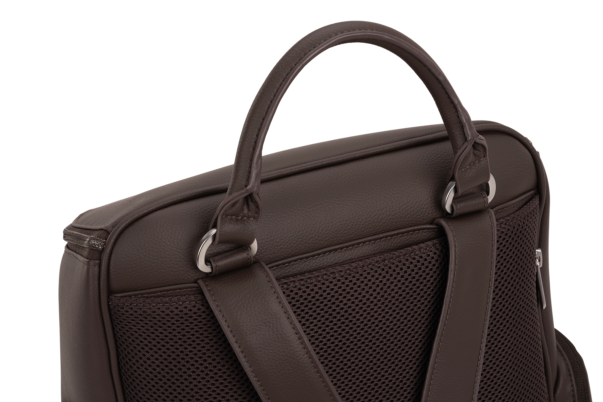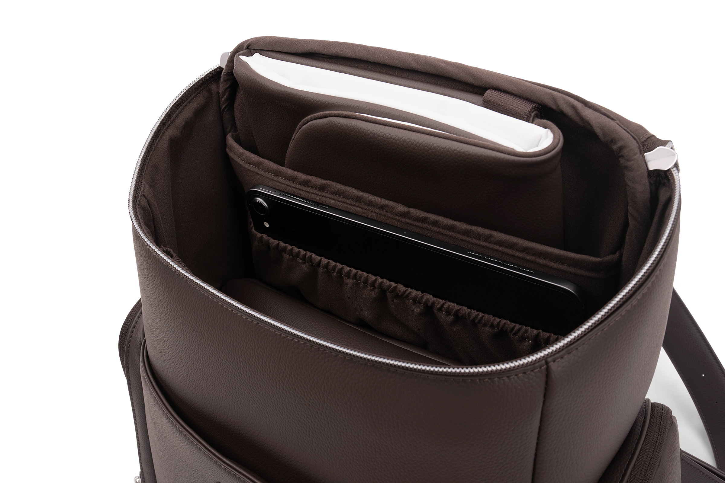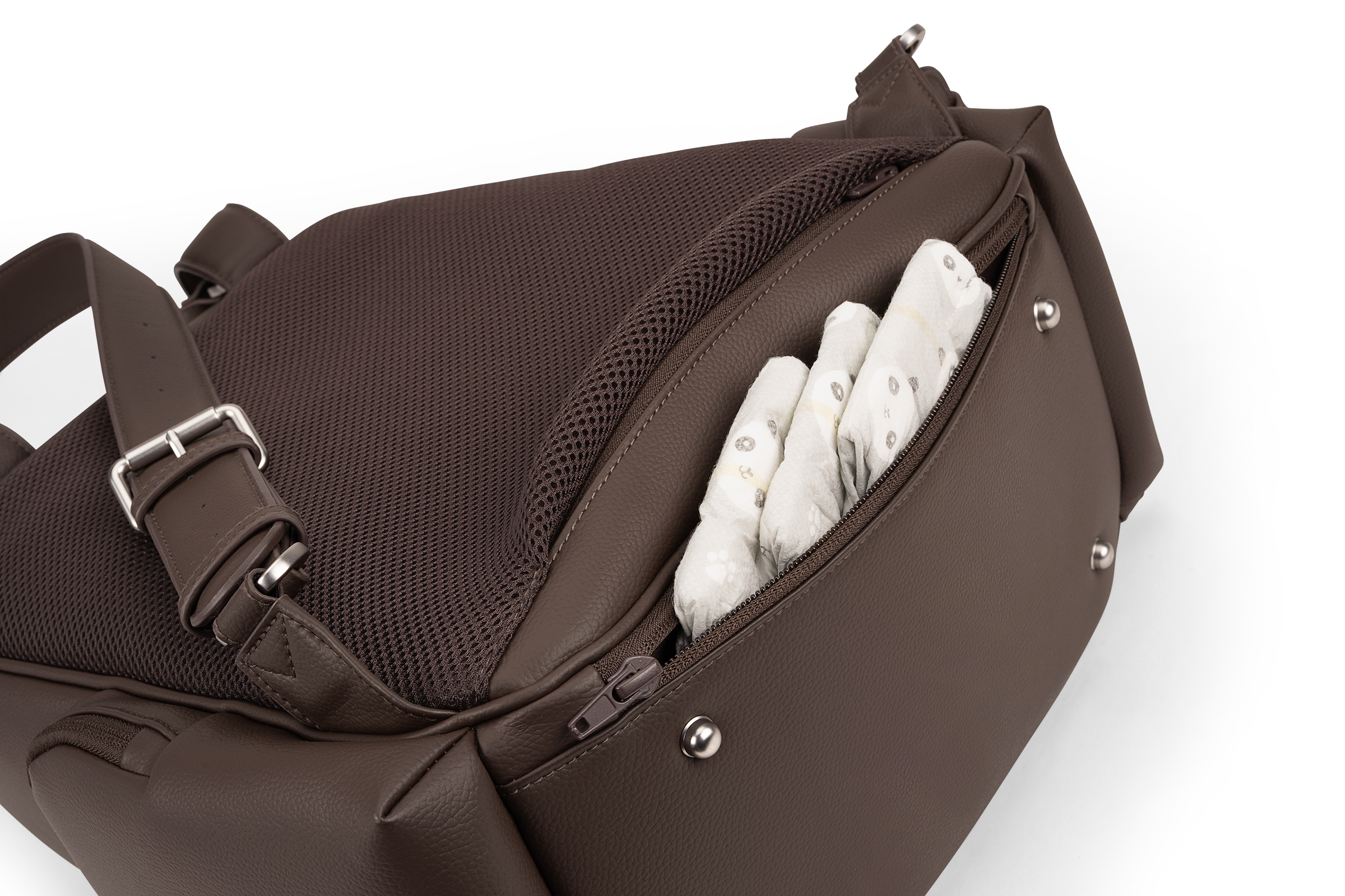 The Essential bag redefines everyday luxury with its chic leatherette styling and versatile parenthood functionality. Crafted as a multi-tasking backpack that also serves as a diaper bag, it features a laptop-friendly design with a thoughtful array of exterior and interior pockets, a handy changing pad clutch, and a luggage trolley sleeve for travel convenience.