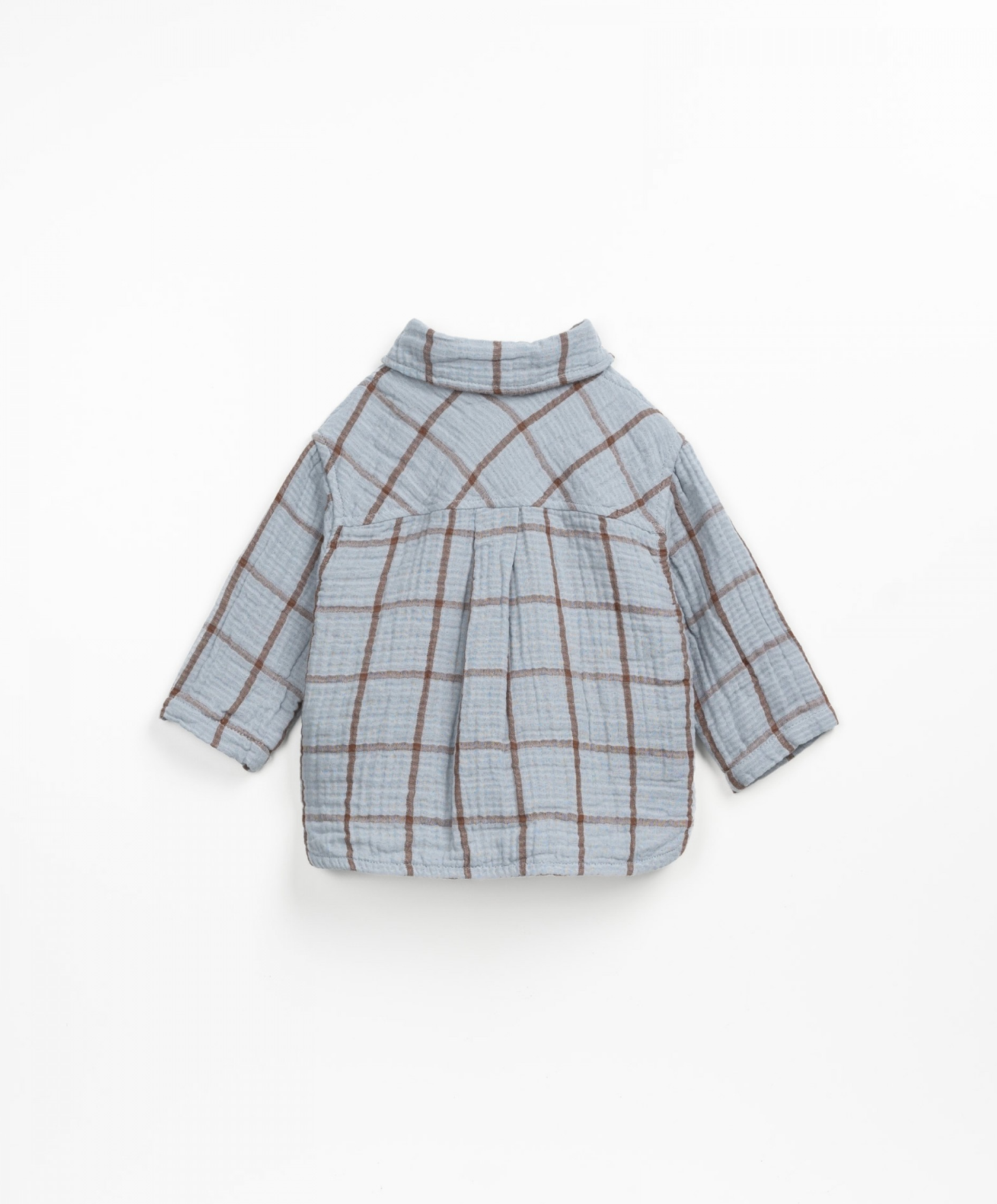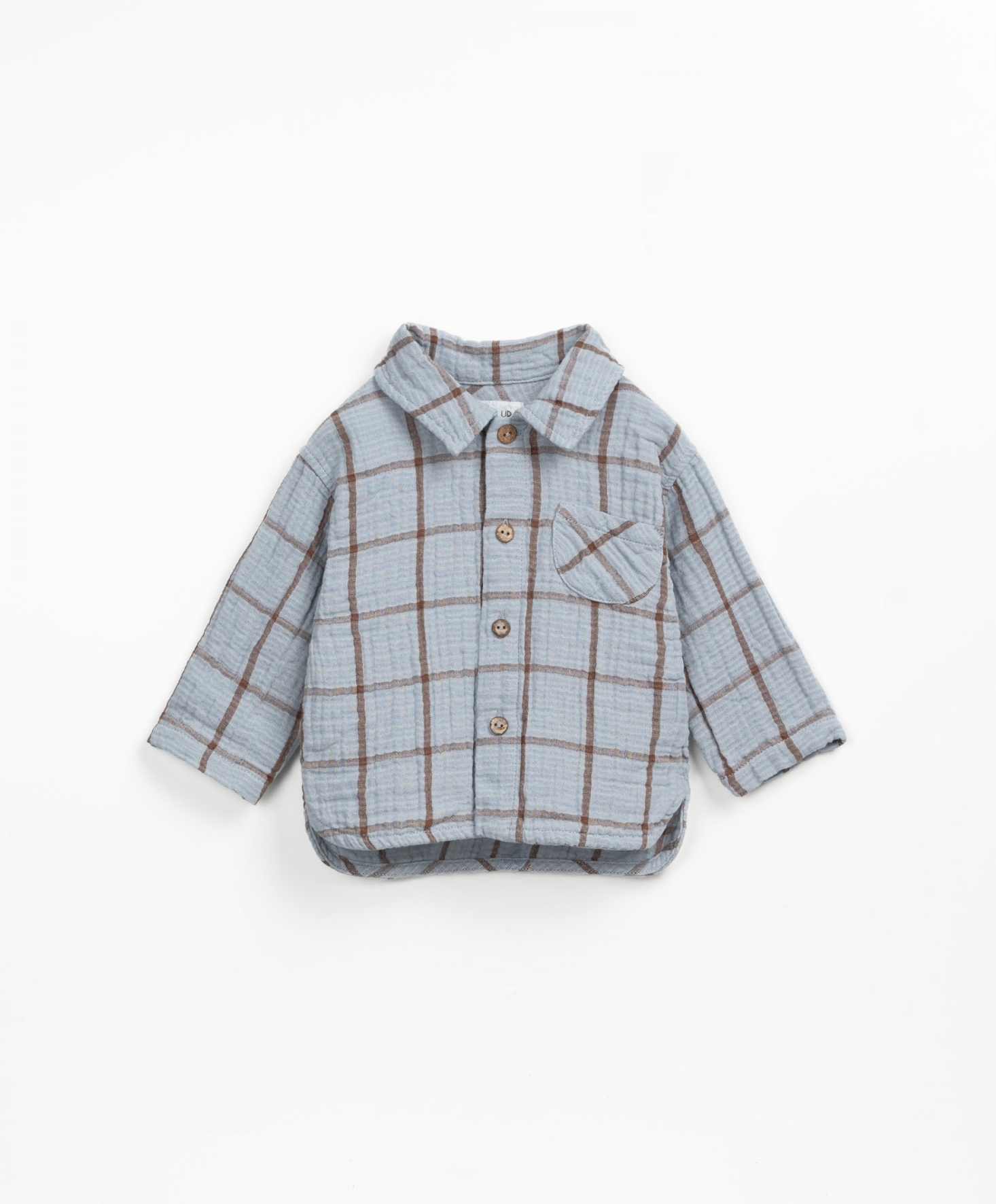 This woven shirt is made from organic cotton, Blue color. The model has a collar application, a front opening with coconut buttons, a chest pocket and a checkered pattern.