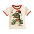 Bring the fun this season with the Ho Ho Ho Ringer Tee! Featuring a cool dinosaur in a Santa hat, this cream base tee shouts ‘Ho Ho Ho’ with a playful festive vibe. Crafted from soft cotton and elastane, the red ribbed neckline and armholes make it perfect for any holiday adventure!
