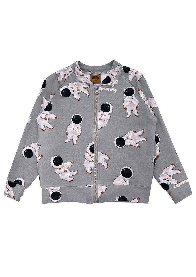 Autum/winter collectio "To the Moon & Back" bomber jacket with allover astronout print. This product is made of cotton from a trusted European supplier. Our fabrics are soft but durable, without harmful chemicals. Made and designed in Riga, Latvia. Composition: 95% cotton, 5% elastane. Machine wash with similar colors clothes 40°C, without drying.