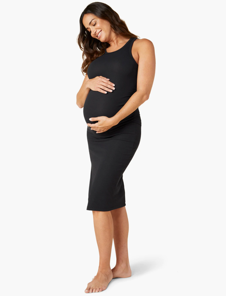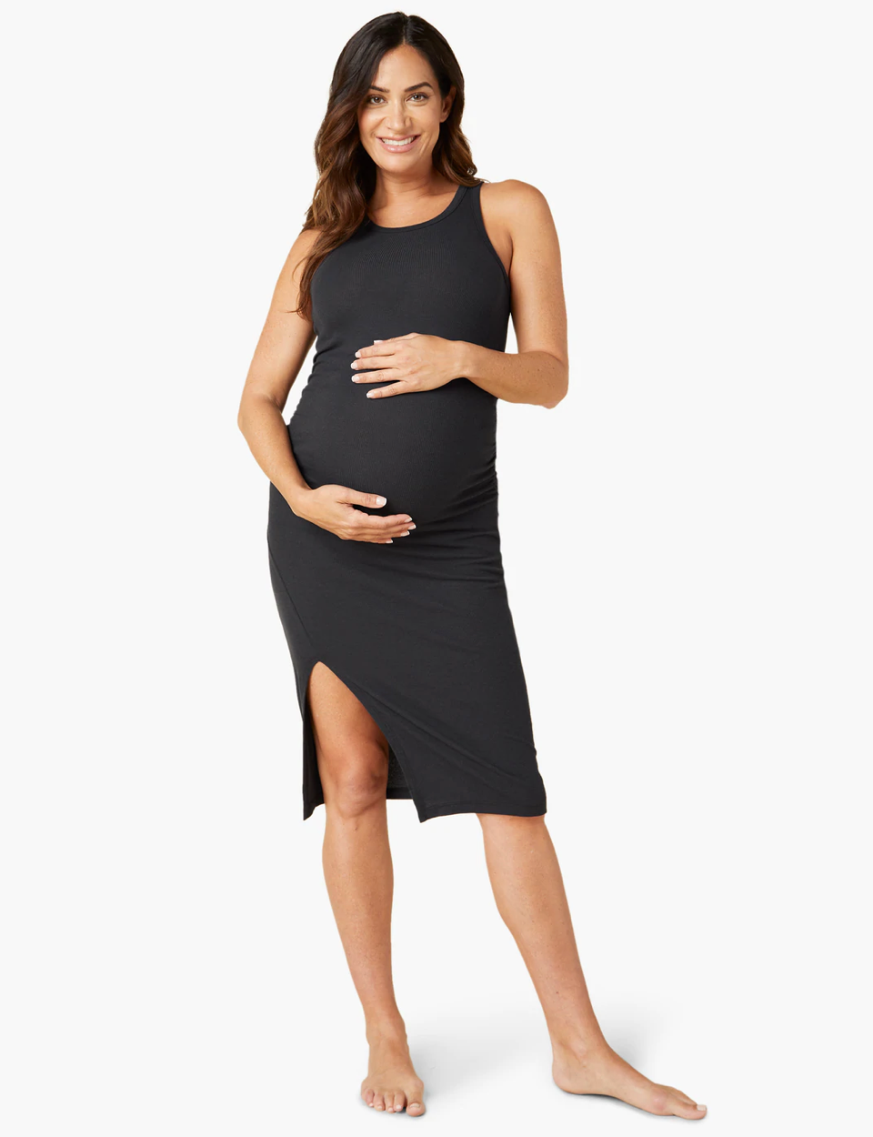 Finally, a maternity dress you can wear *literally* everywhere, during and after pregnancy! Chic high rounded neckline, sleeveless, in a midi length, but what really makes this dress a must-have is it's slit leg and ruched waist, making it as flattering as it is comfortable to wear.