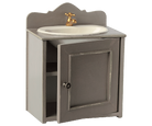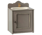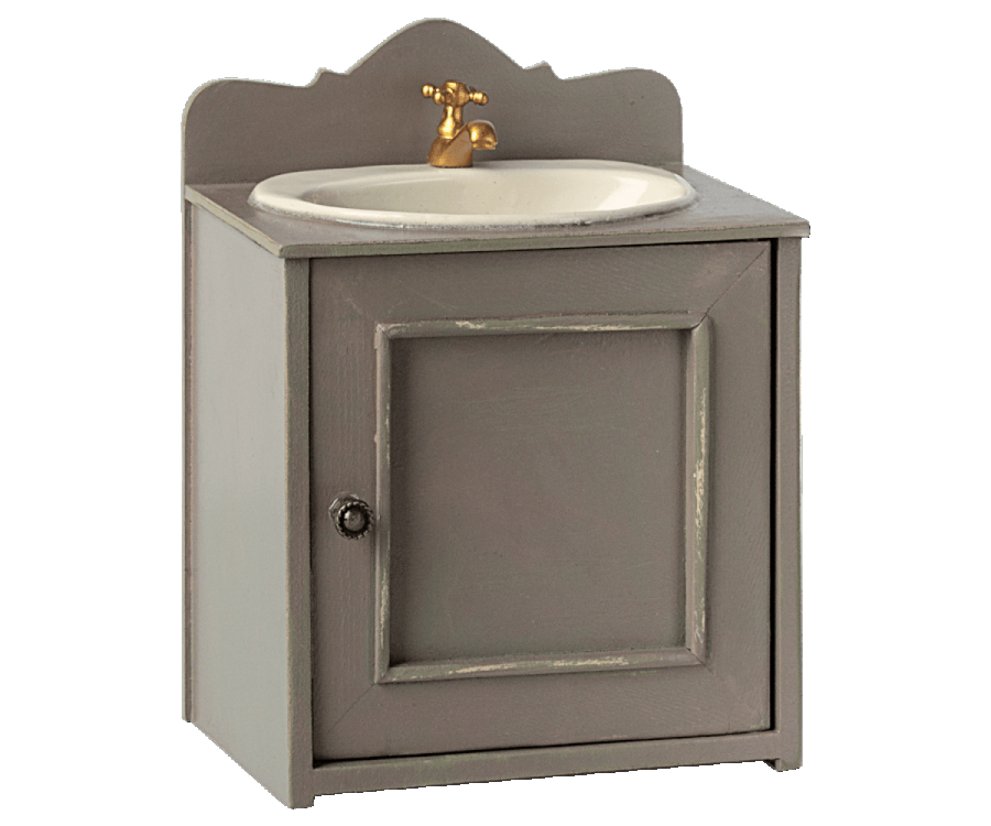 A beautiful vintage metal sink with a golden water tap. The sink with wooden storage shelves, where you can store your personal belongings.