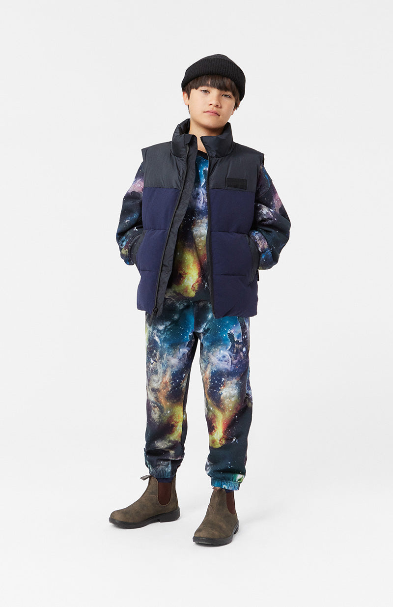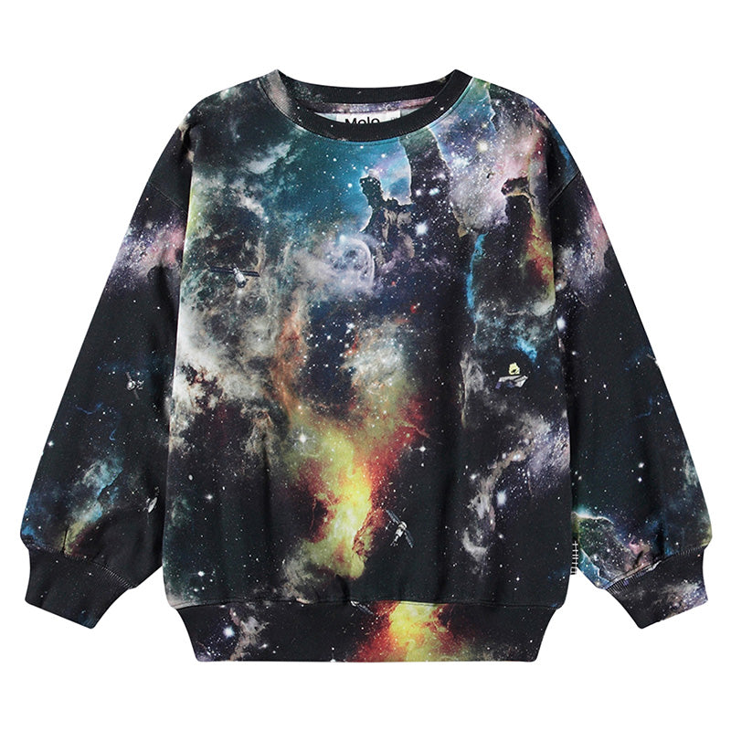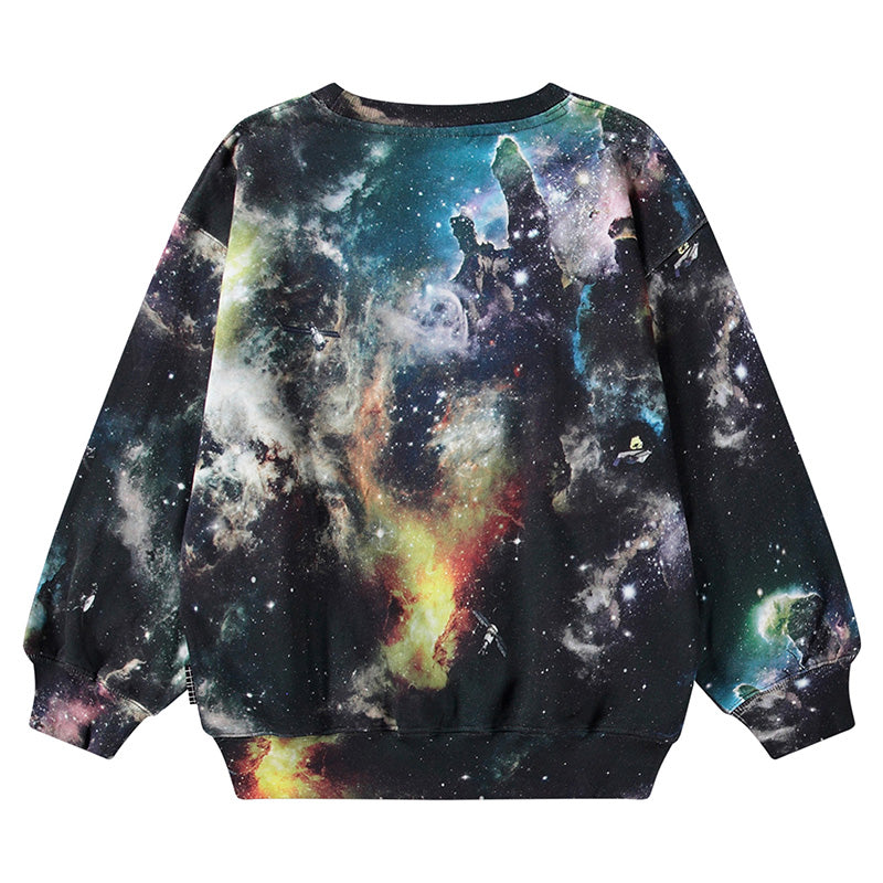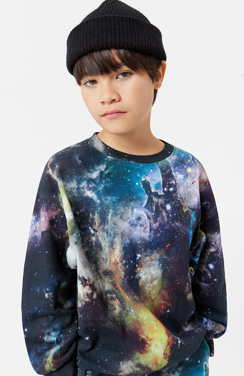 Multicoloured sweatshirt in organic cotton with a brushed inner face, making it soft and warm to wear. The sweatshirt has a loose fit, round neckline, and rib cuffs and hem. The all-over print is inspired by an image from the James Webb Space Telescope and depicts outer space. If you look closely, you might spot some floating satellites.