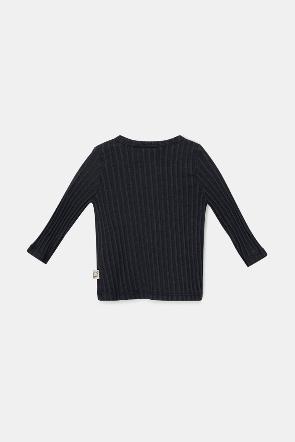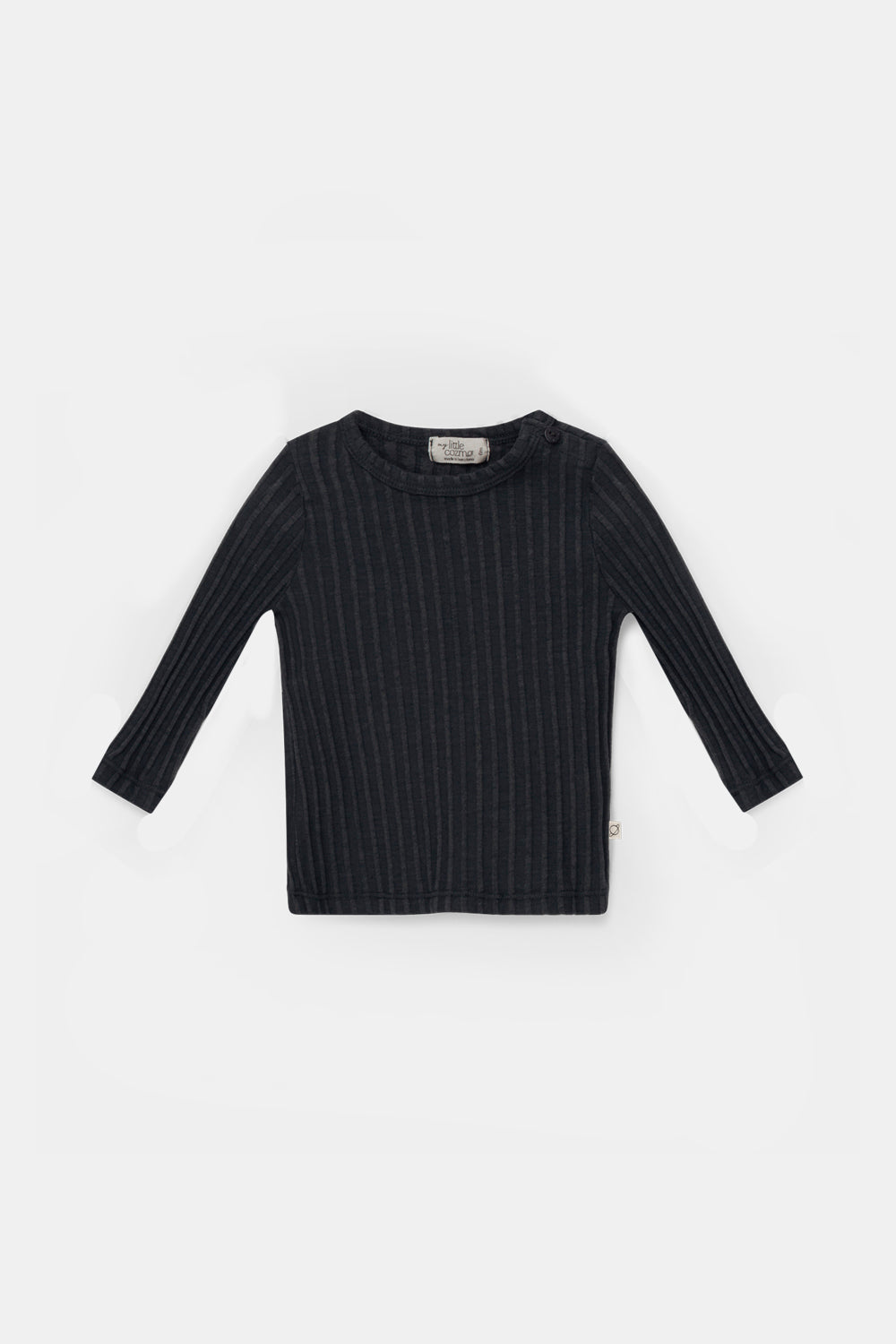 This organic rib baby T-shirt has a crew neck, a button shoulder opening, long sleeves, and a straight hem. 94% organic GOTS-certified cotton, 6% elastane.
