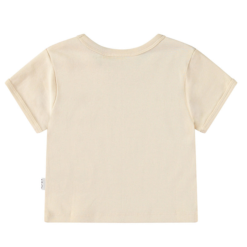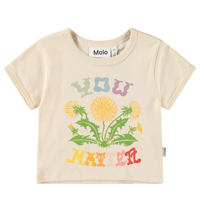 Beige cropped t-shirt in organic cotton with a round neck and ribbed edges. The t-shirt is fitted with a front print of blooming dandelions and the text 'You Matter'.