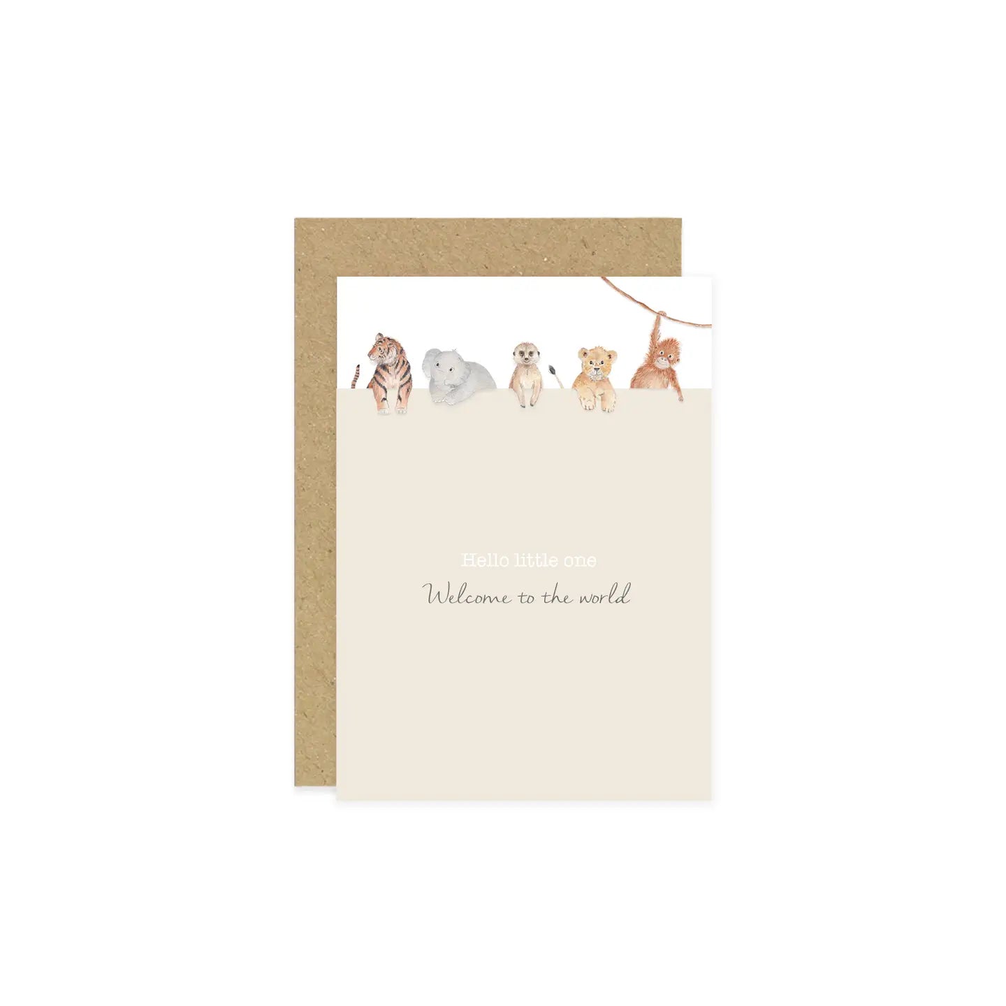 A menagerie of creatures rest playfully on this new baby card, popping their little paws over the cream background over the caption, which reads “Hello Little One, welcome to the world”. The tiger, elephant, meerkat, lion cub and orangutan peer on with little smiles, creating a comforting and gender neutral new baby card design that's perfect for all sorts of growing families.