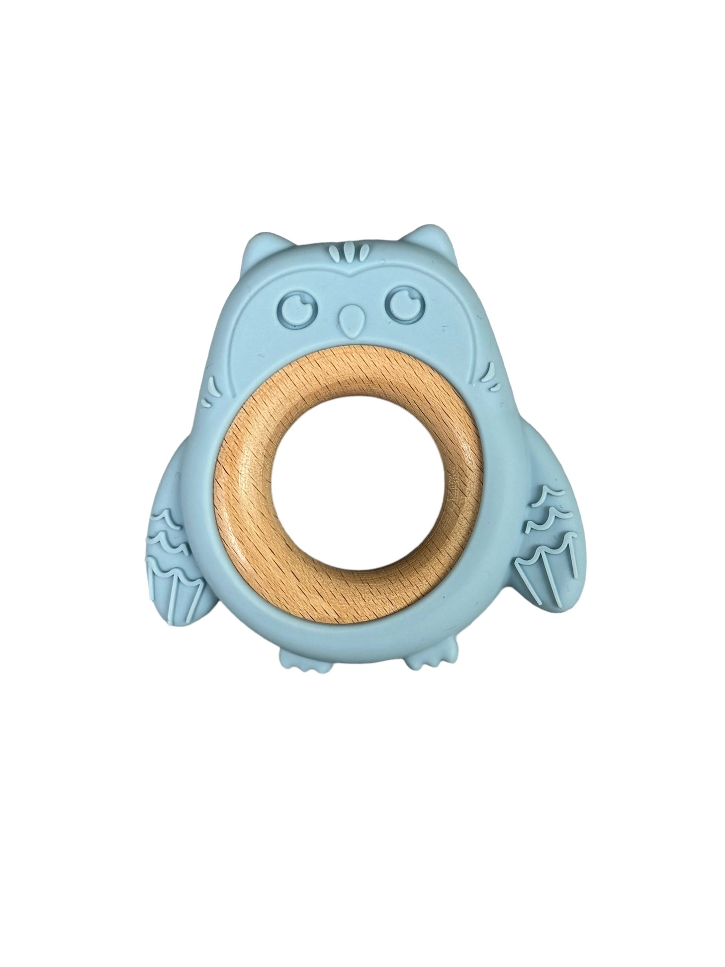 Silicone & Beechwood Teether Ring Owl - Baby Blue