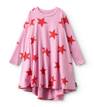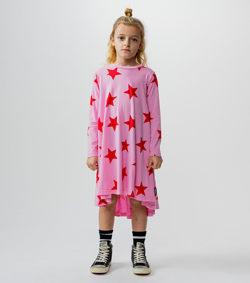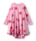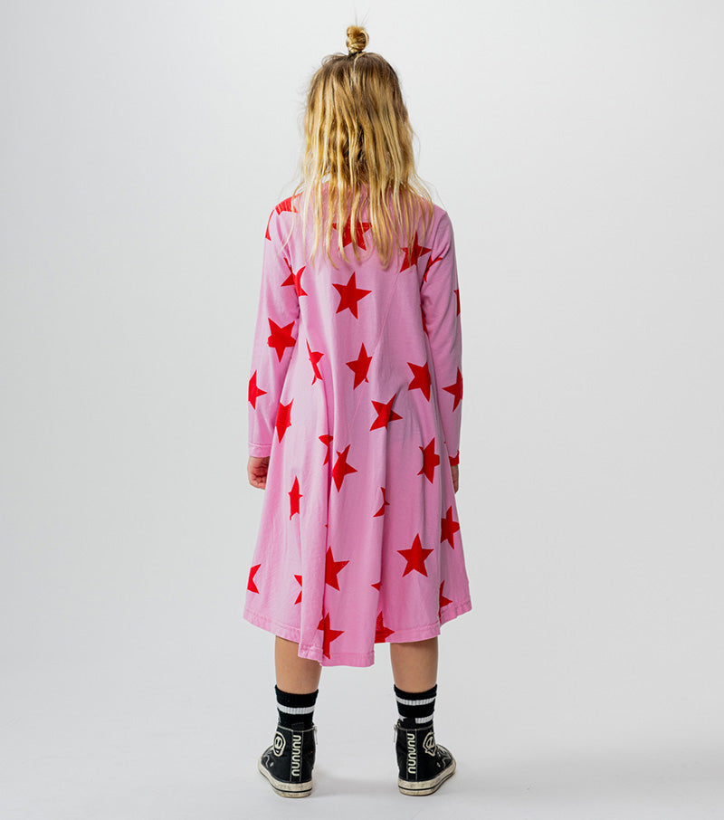 our signature star print is the perfect complement to this long sleeve drapey 360 dress in super pink. good for twirling around town, it’s longer in back for a high-low feel, but never bulky—super comfy for an all-day look. side pockets add function and the diagonal seam through the front adds flair. a beloved nununu classic.