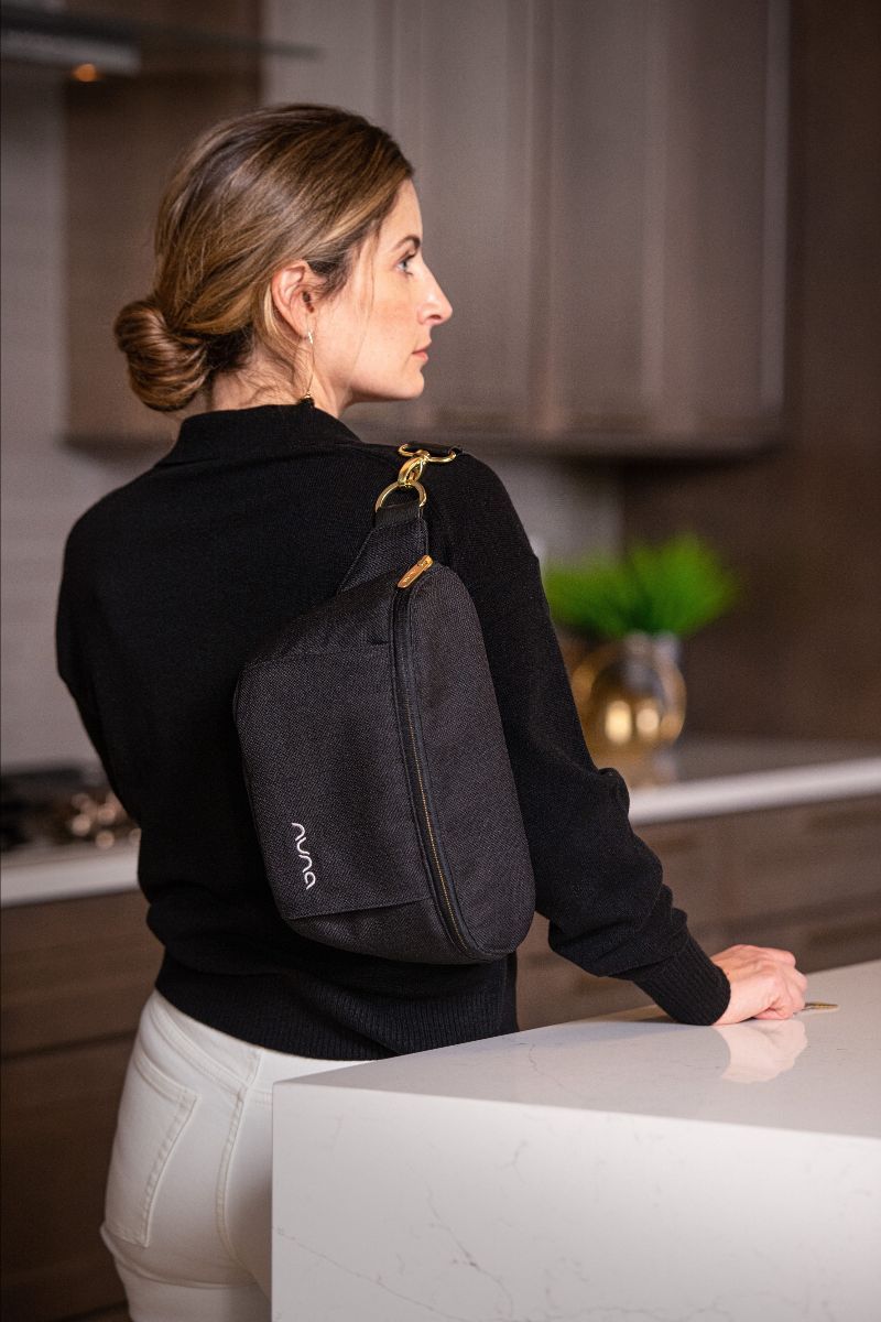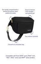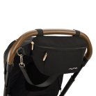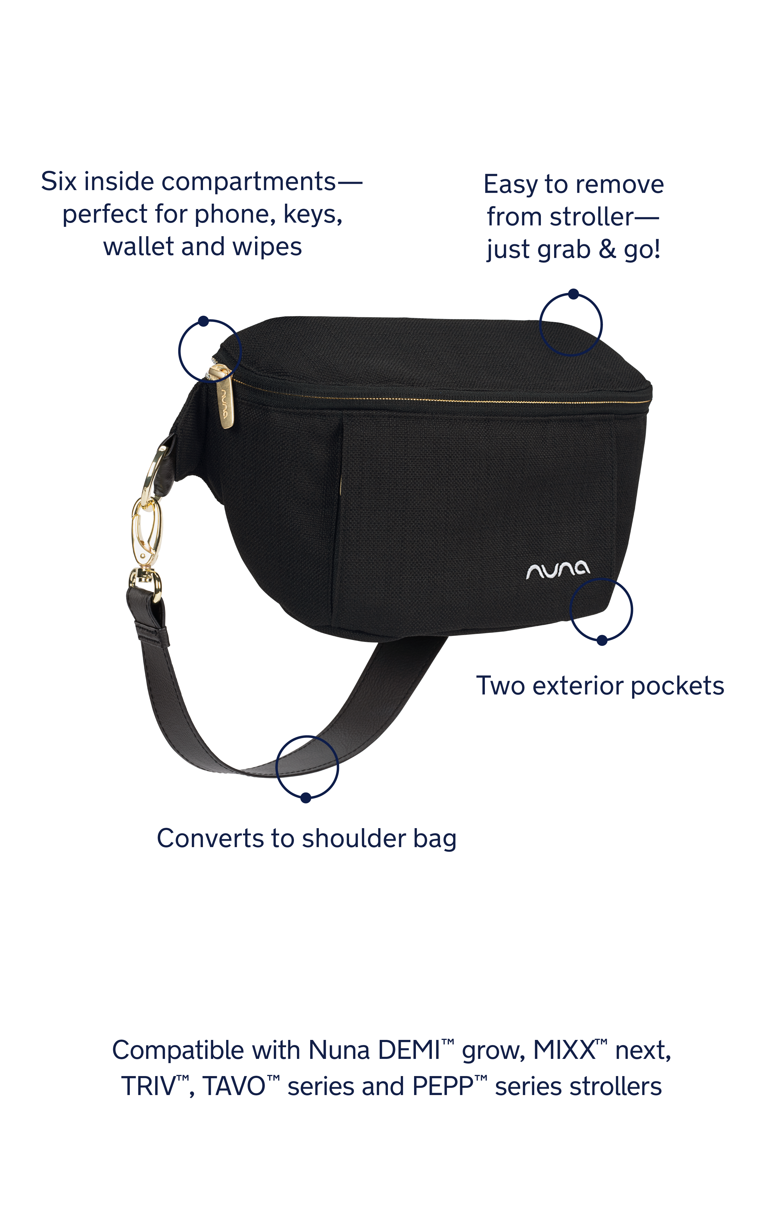 Keep it in reach while on the go. Small in size but big on detail, the Nuna stroller sling bag has six inside compartments and two outside for easy access to essentials. Compatible with all Nuna strollers (except the TRVL™ and TRIV™ next) it easily attaches to the push bar, keeping it organized and in reach. A luxe leatherette carry strap quickly converts it to an over-the-shoulder tote bag. Just attach or remove and go.